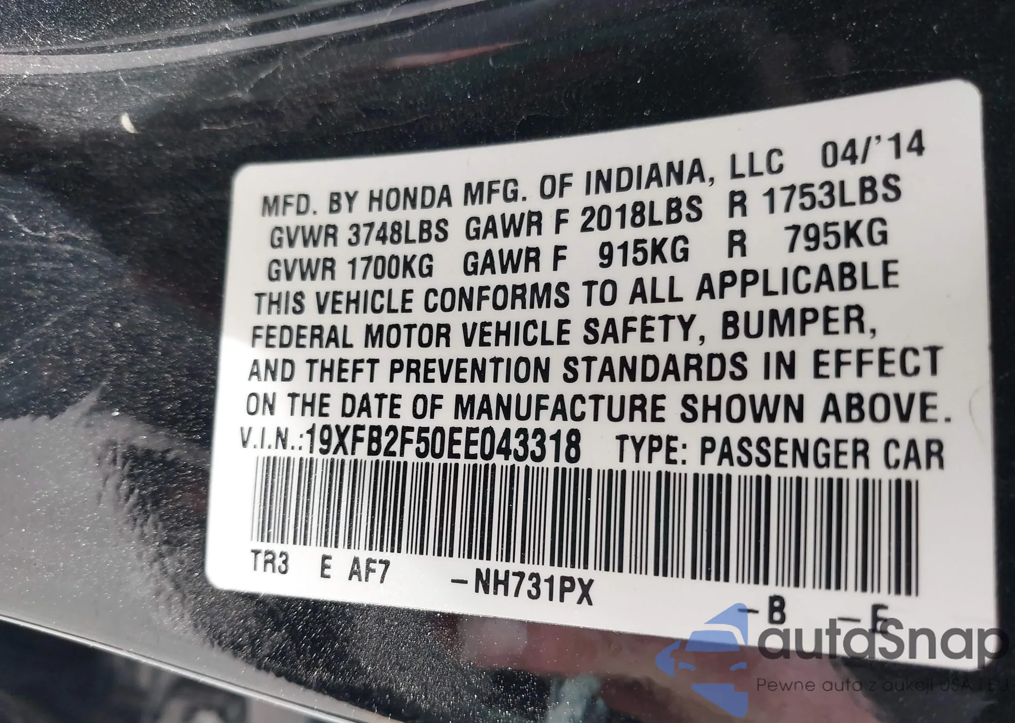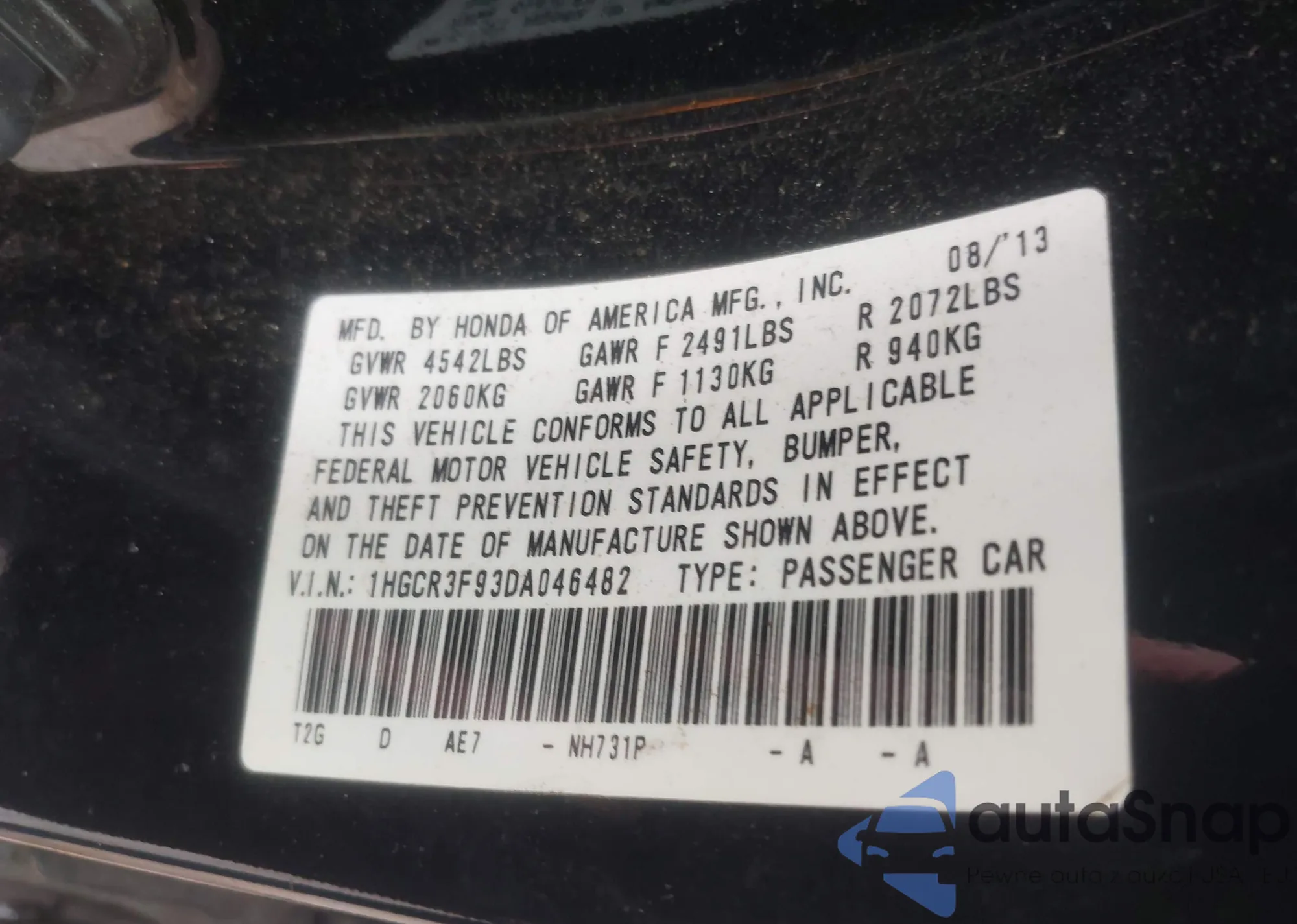 LOT: 43412801 VIN: 1HGCR3F93DA046482