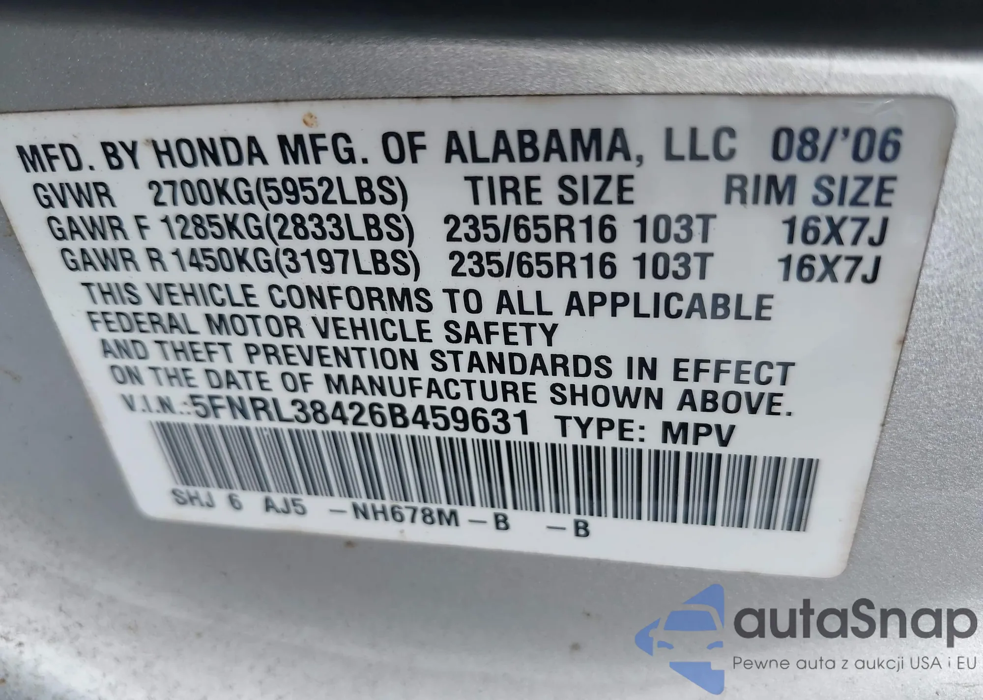• VIN 5FNRL38426B459631