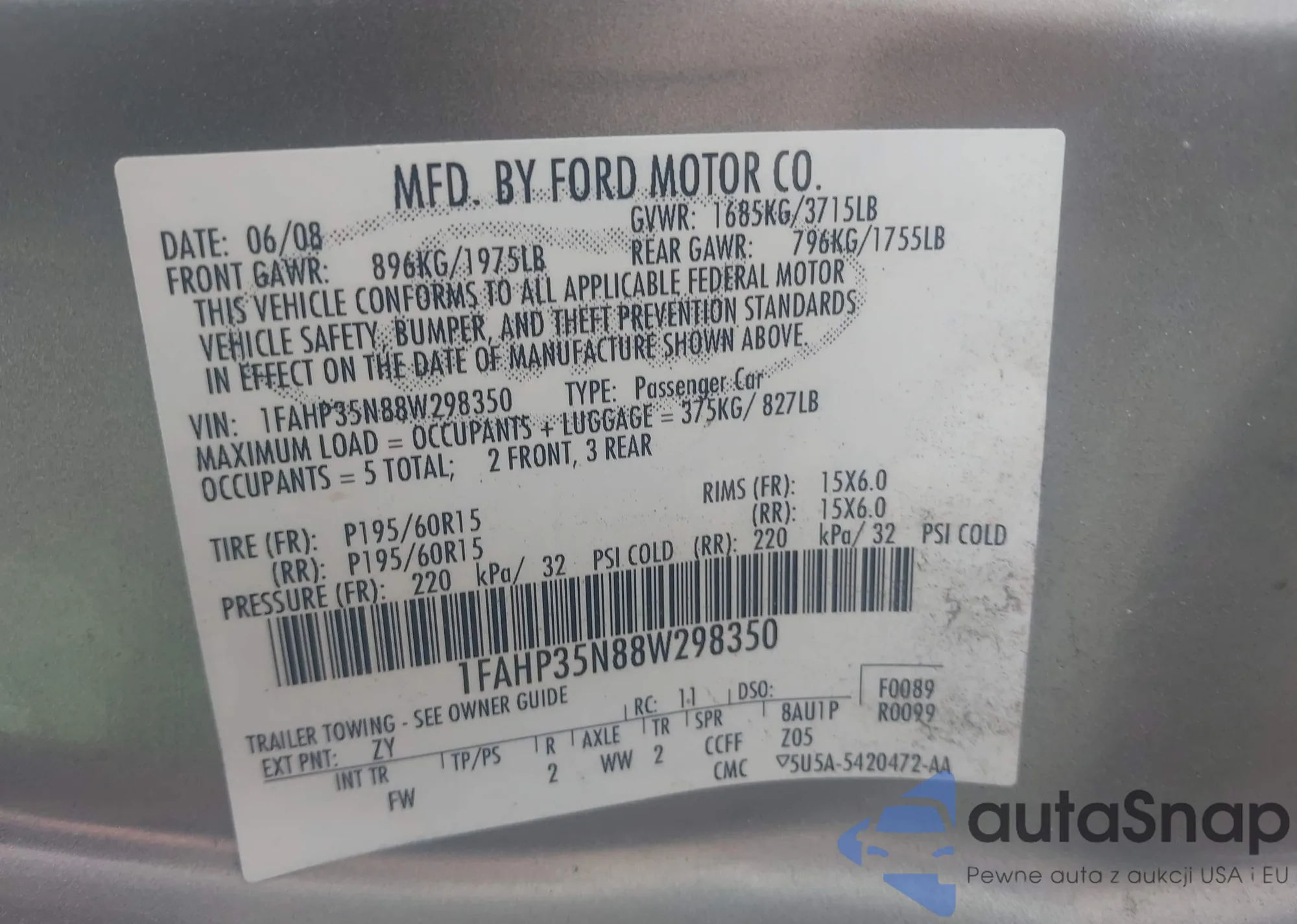 LOT: 43231415 VIN: 1FAHP35N88W298350