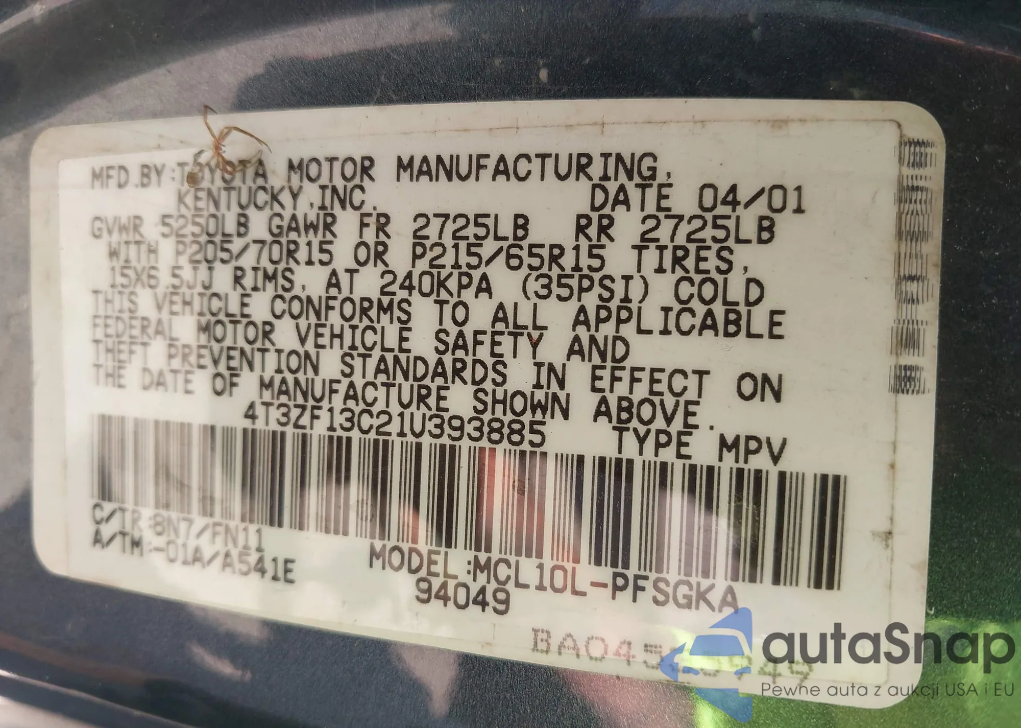LOT: 43258609 VIN: 4T3ZF13C21U393885