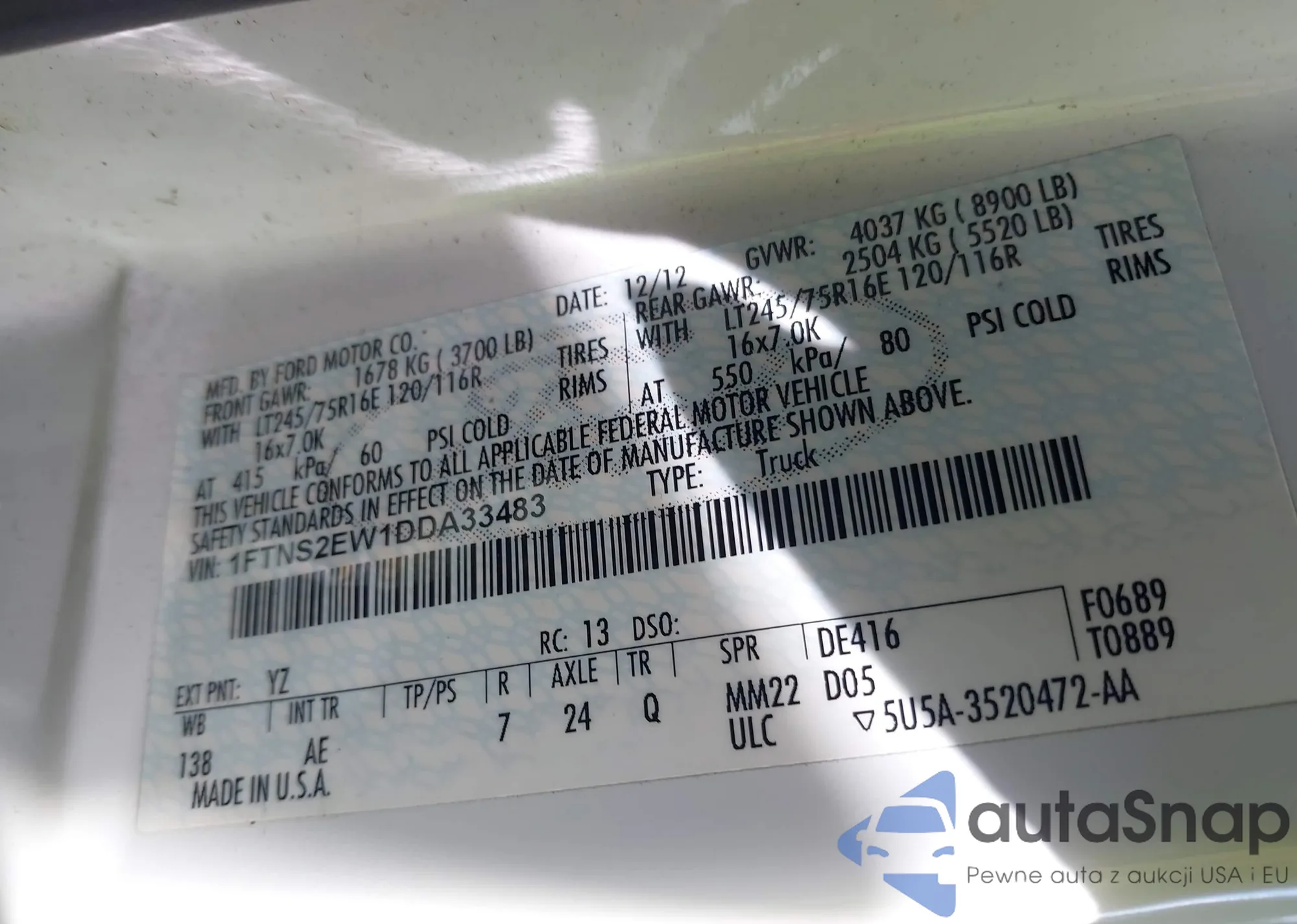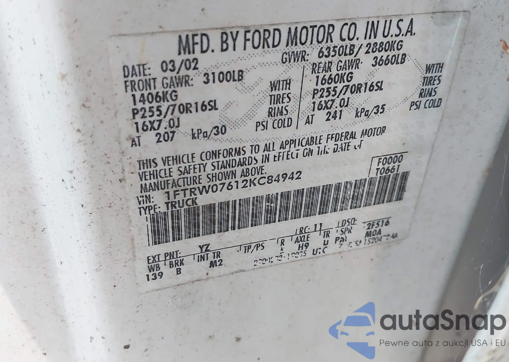 LOT: 43330936 VIN: 1FTRW07612KC84942