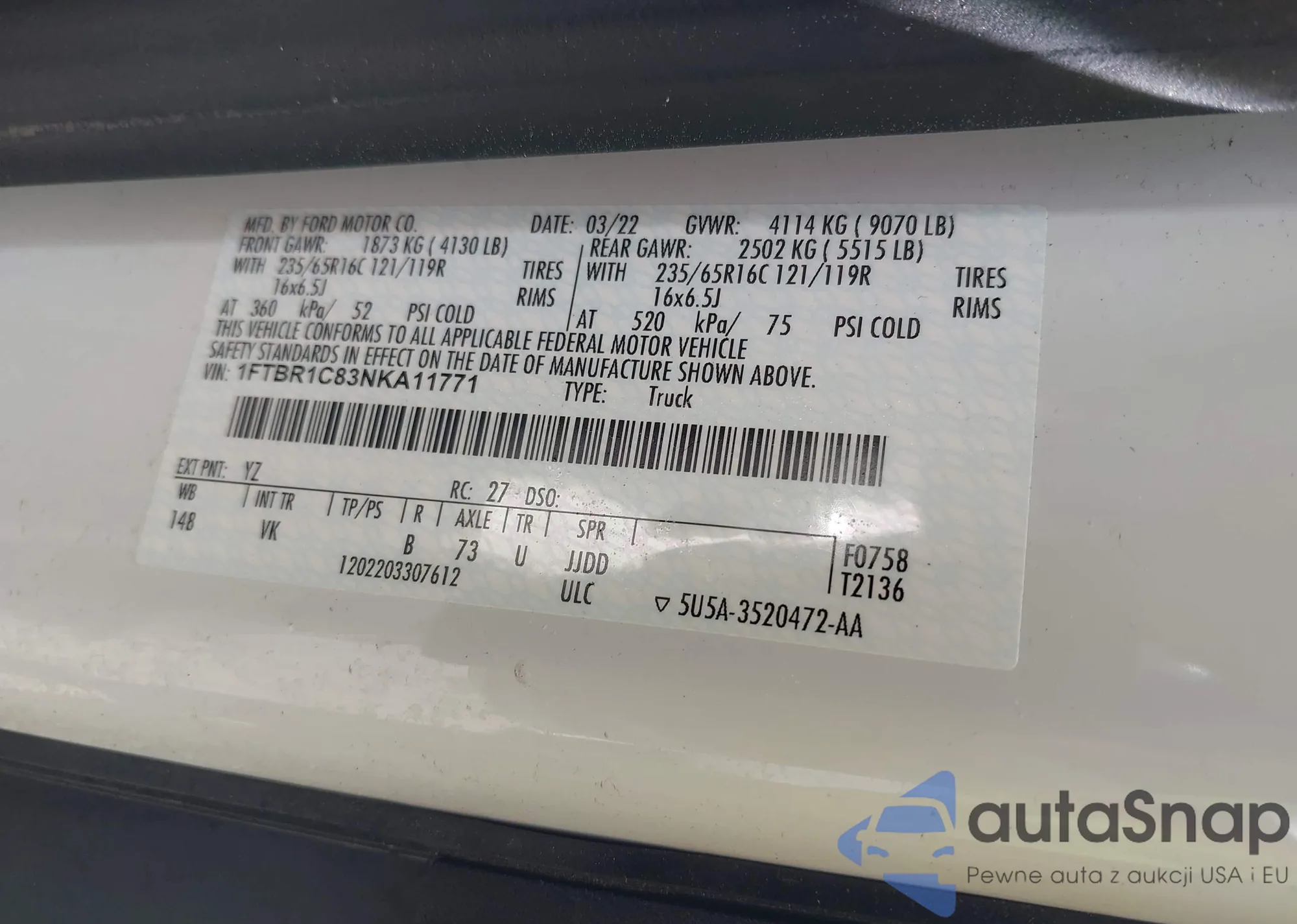 LOT: 42528577 VIN: 1FTBR1C83NKA11771