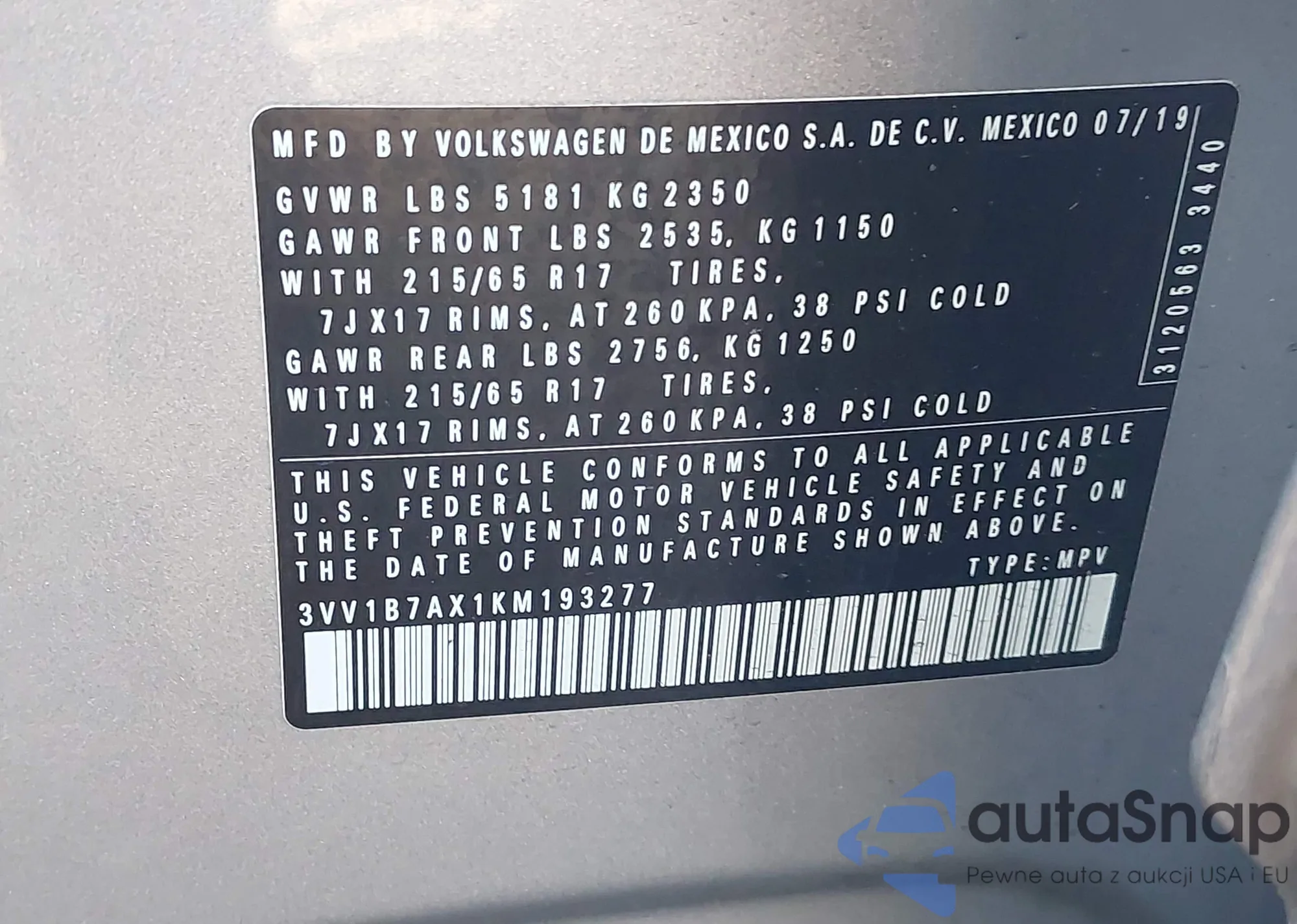 • VIN 3VV1B7AX1KM193277