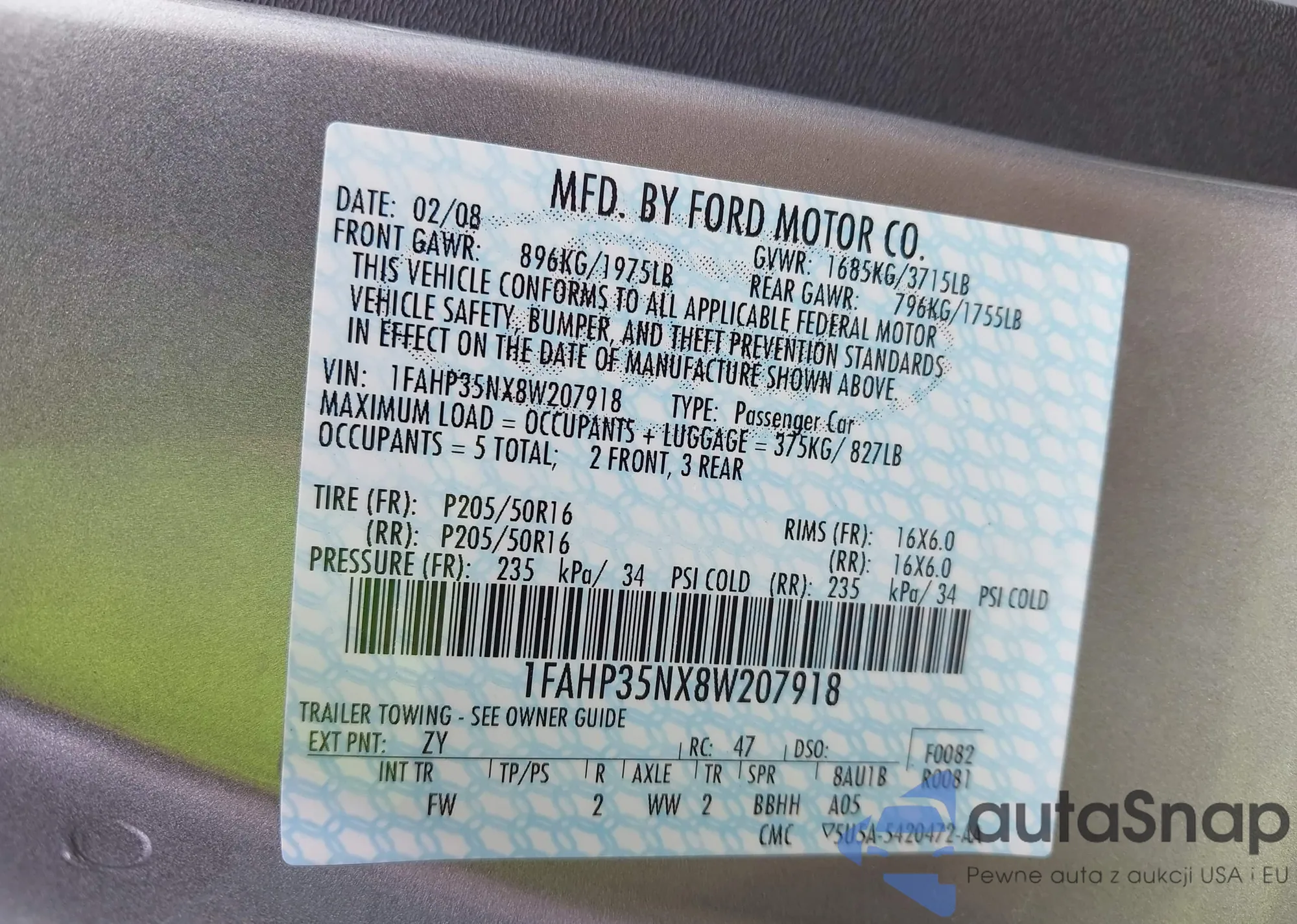 • VIN 1FAHP35NX8W207918