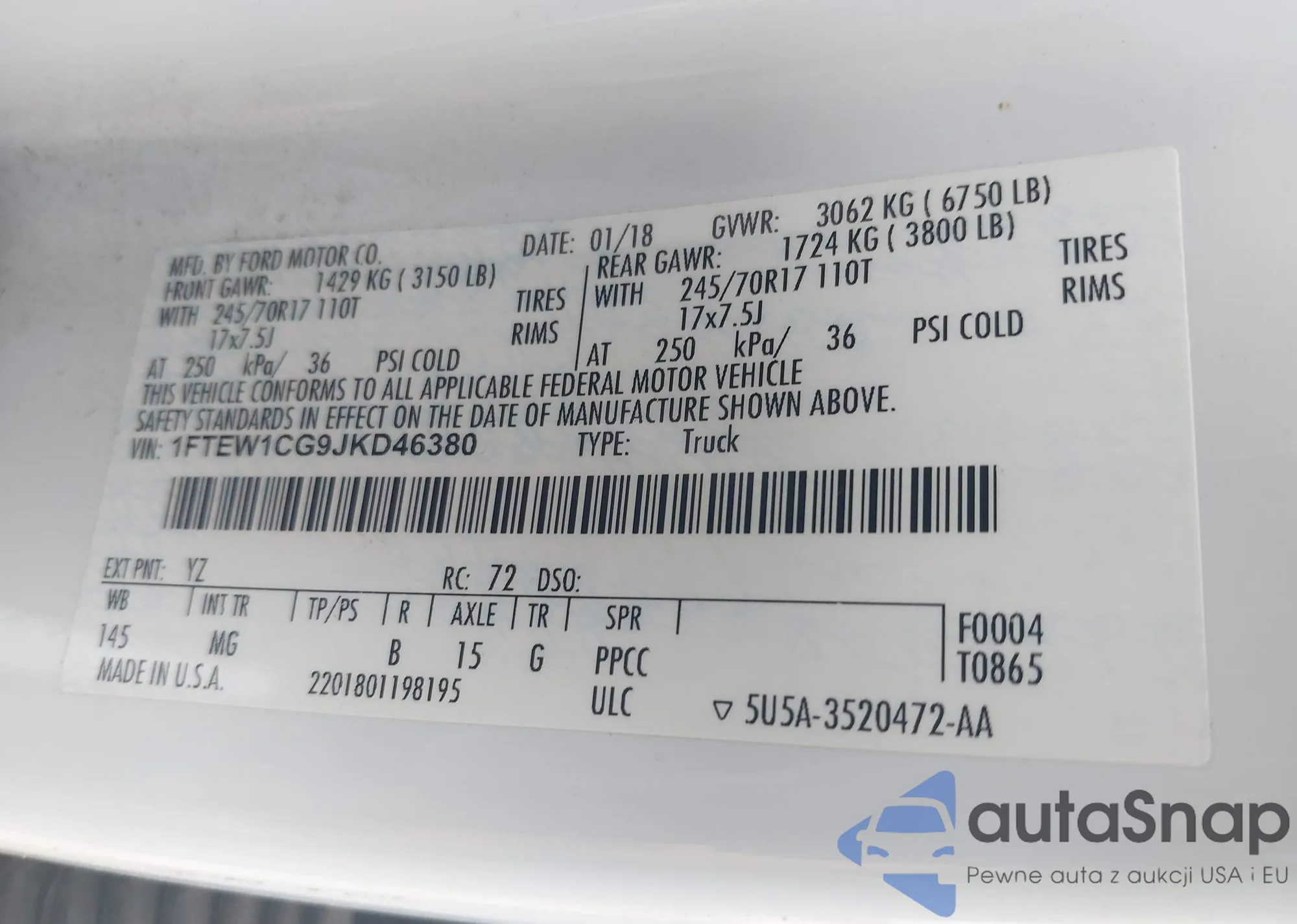 LOT: 43094290 VIN: 1FTEW1CG9JKD46380