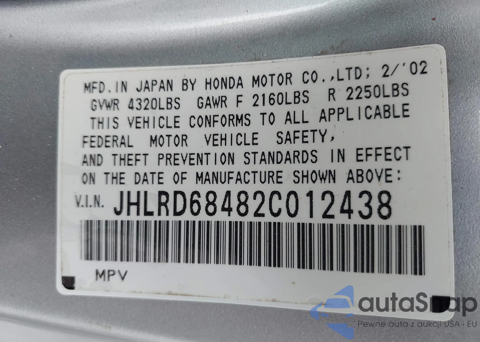 LOT: 43317481 VIN: JHLRE4H76AC010729