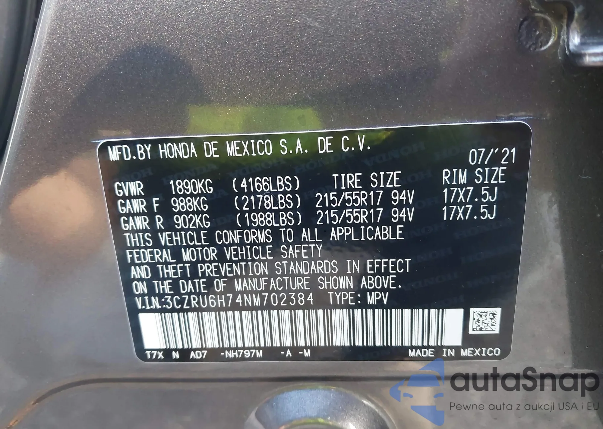 • VIN 2HKRW2H89MH641362