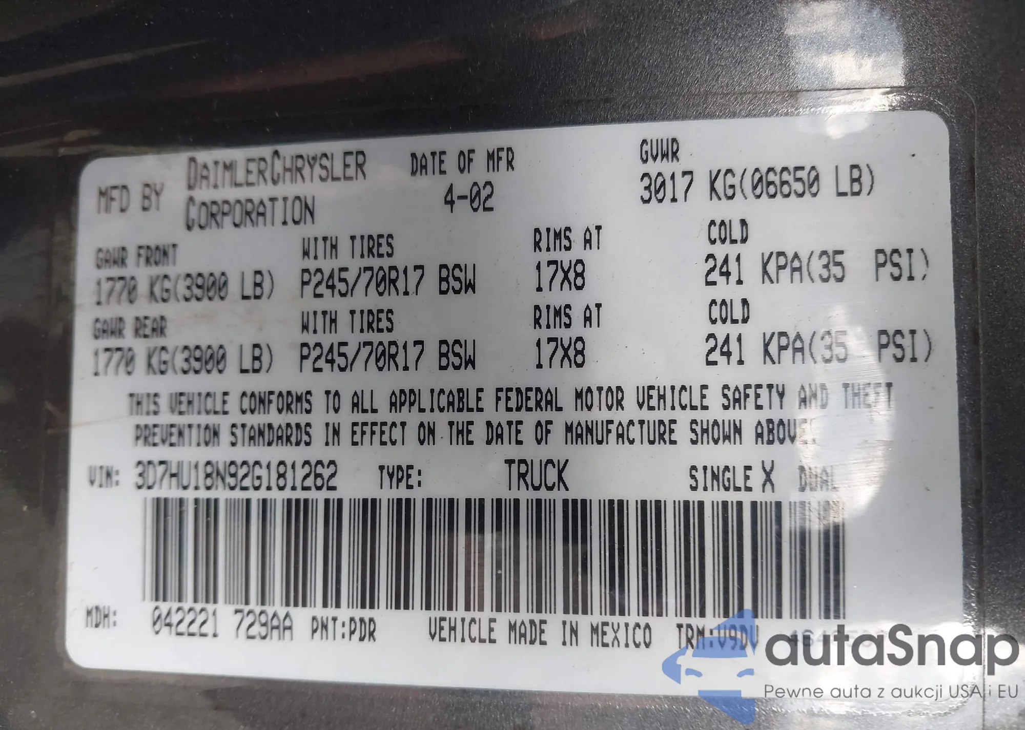 • VIN 3D7HU18N92G181262