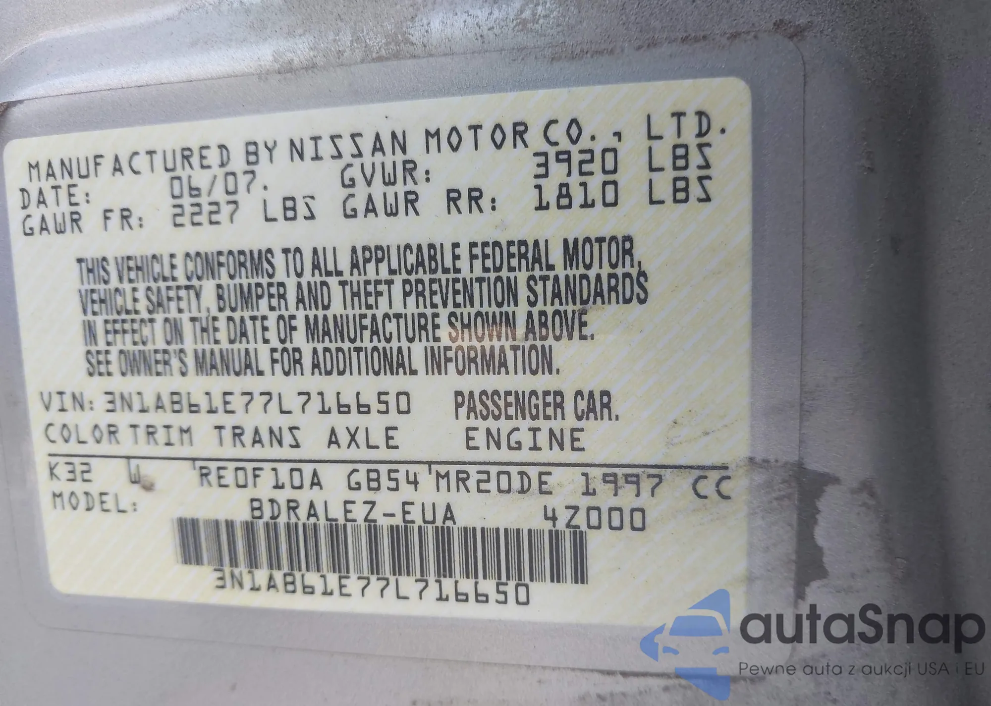 LOT: 42906349 VIN: 3N1AB61E77L716650