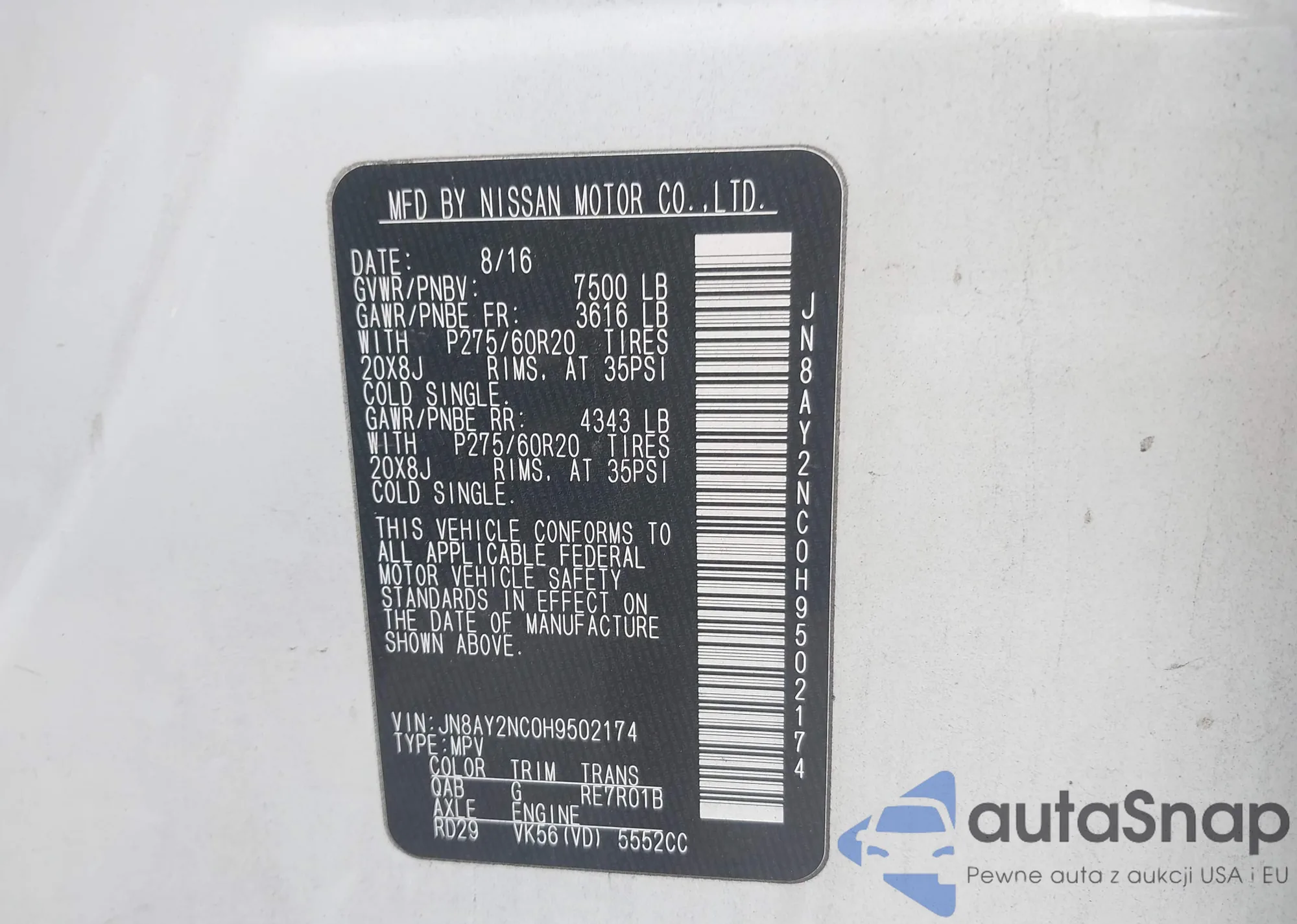 LOT: 42748541 VIN: JN8AY2NC0H9502174