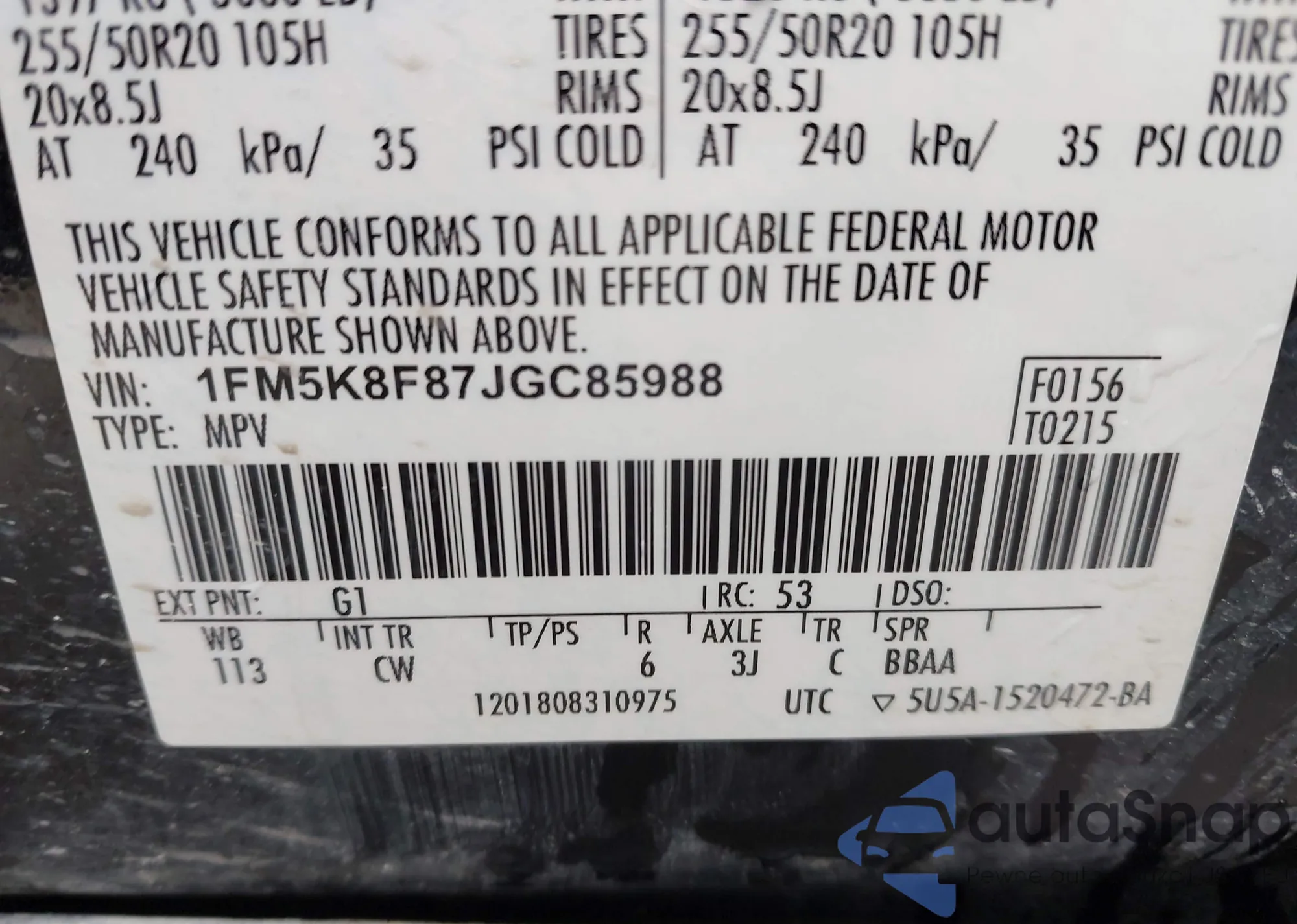 LOT: 43123196 VIN: 1FM5K8F87JGC85988