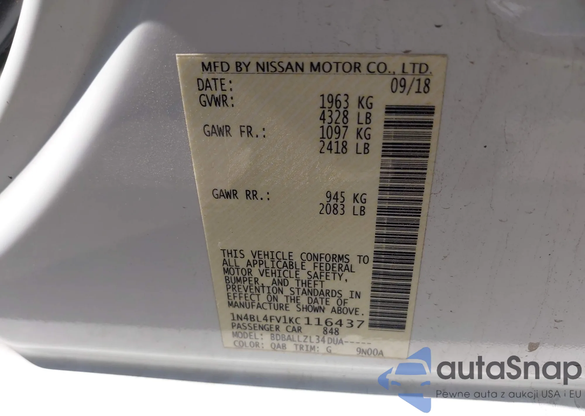 • VIN 1N4BL4FV1KC116437