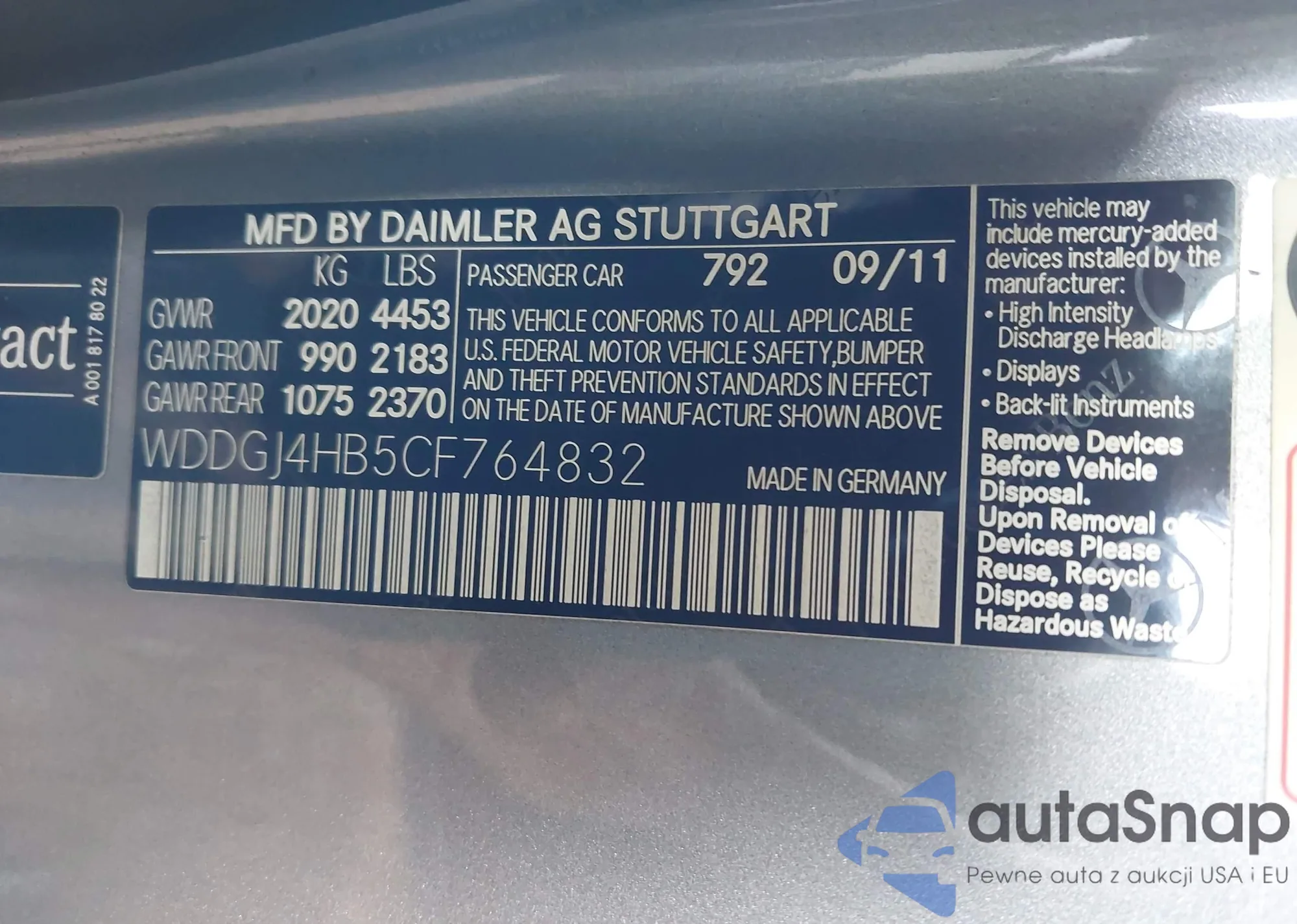 LOT: 43227303 VIN: WDDGJ4HB5CF764832