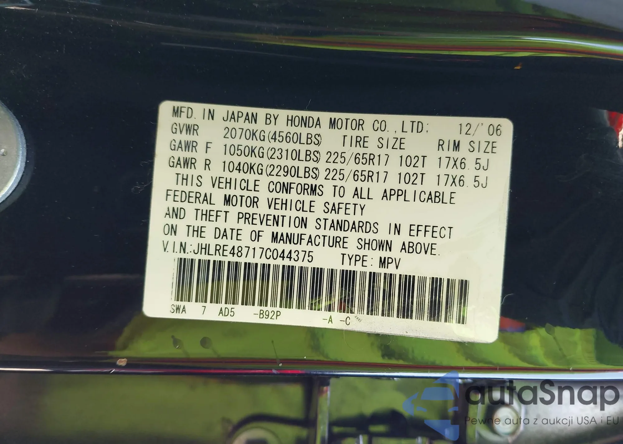 LOT: 43356472 VIN: JHLRE48717C044375