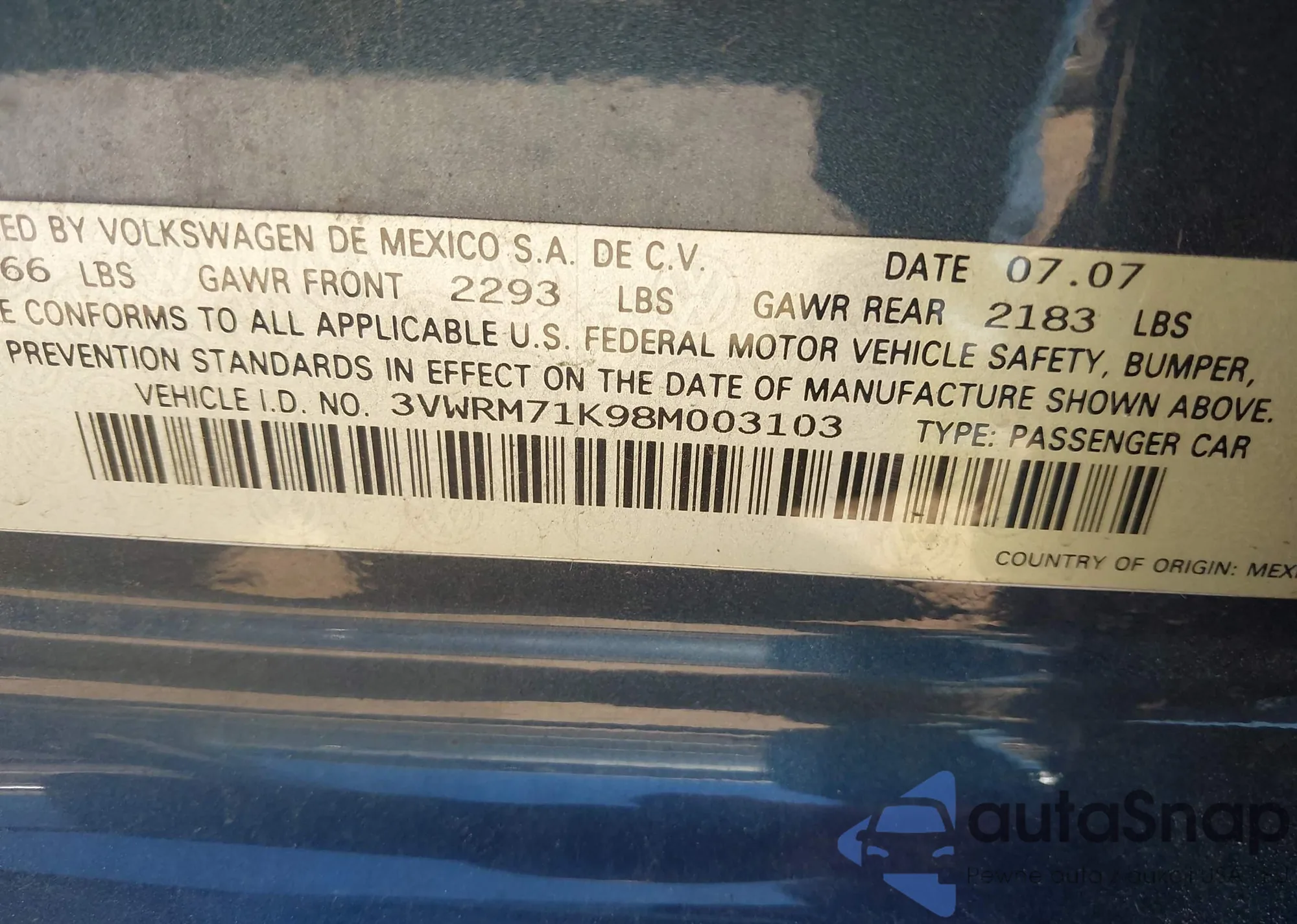 • VIN 3VWRM71K98M003103