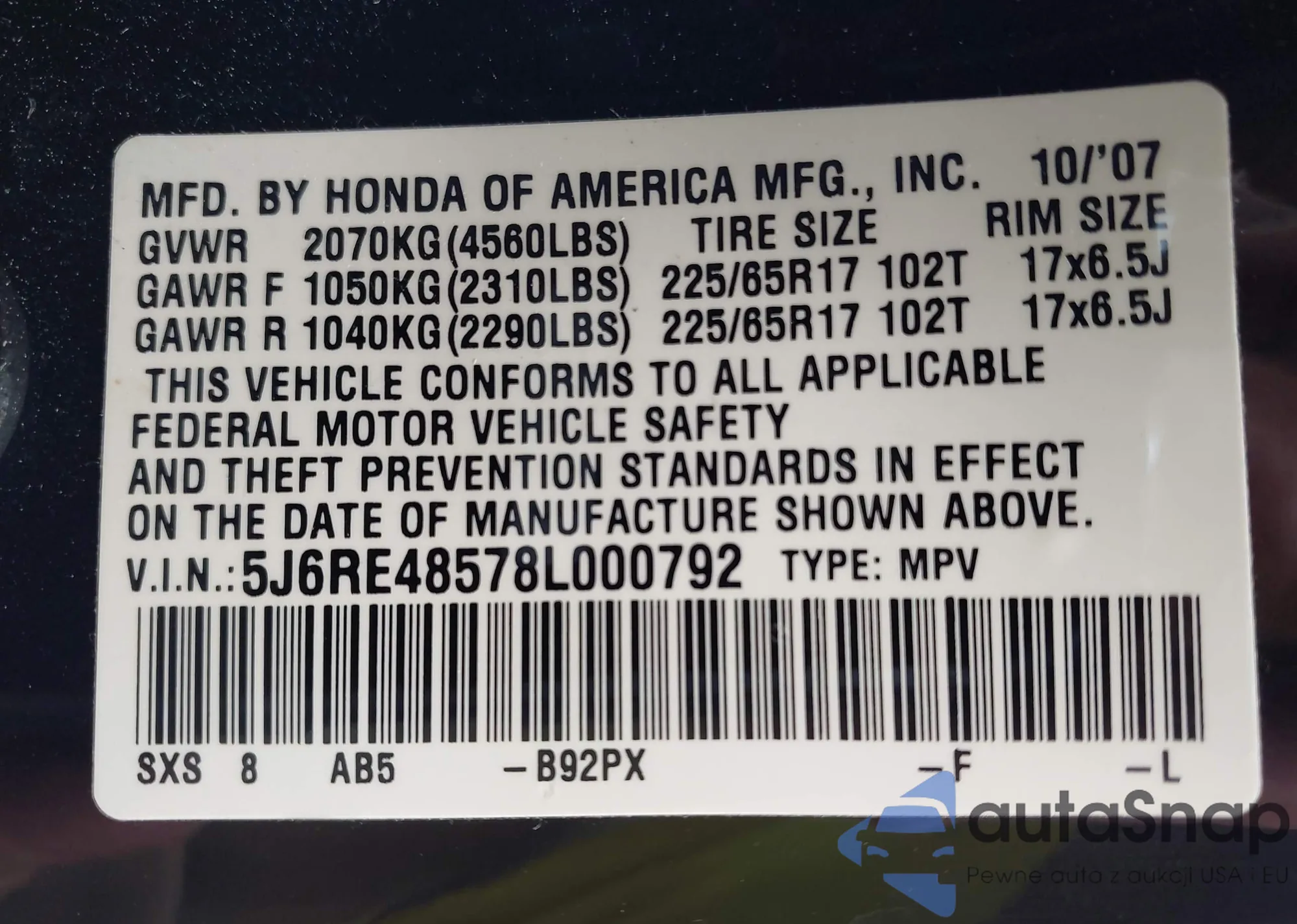 • VIN 1HGCR2F81FA102861
