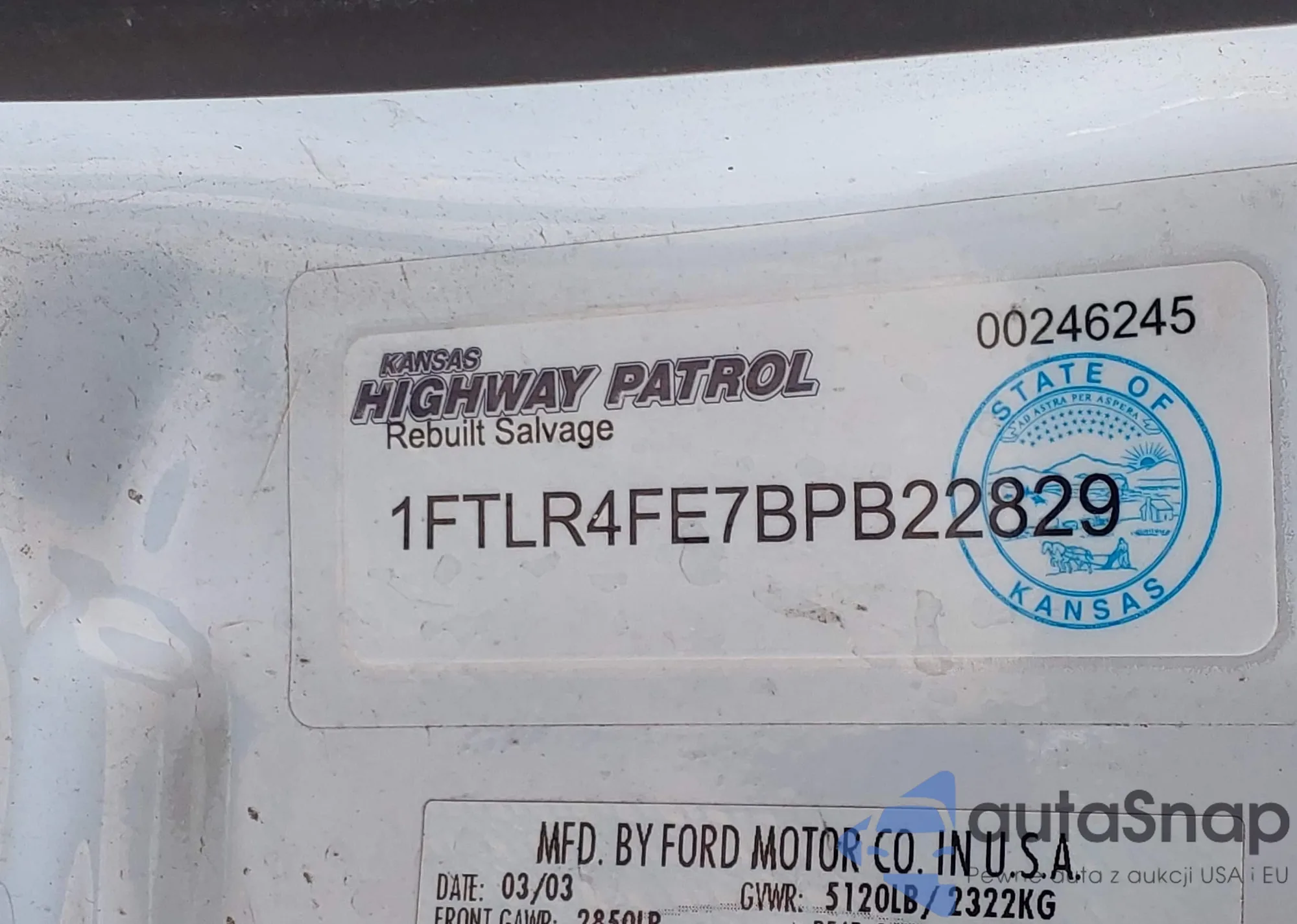 LOT: 43182904 VIN: 1FTZF07251KF91655
