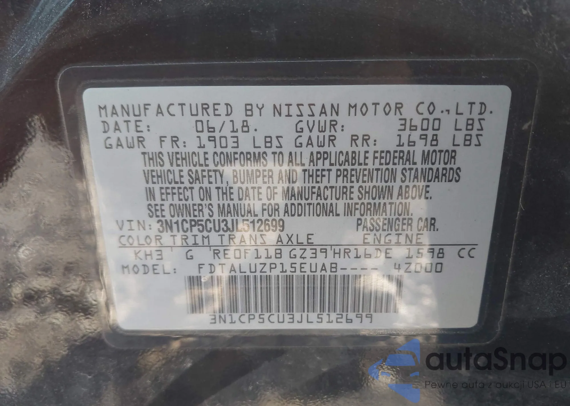 LOT: 43184202 VIN: 3N1CP5CU3JL512699