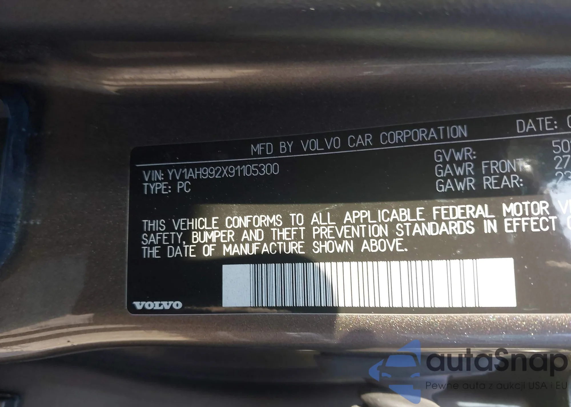 LOT: 43268383 VIN: YV1AH992X91105300