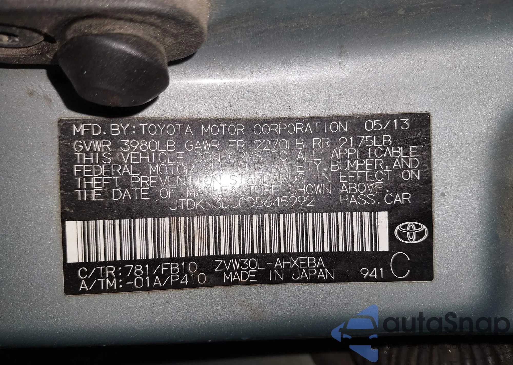 • VIN 1HGCP3F87AA013400