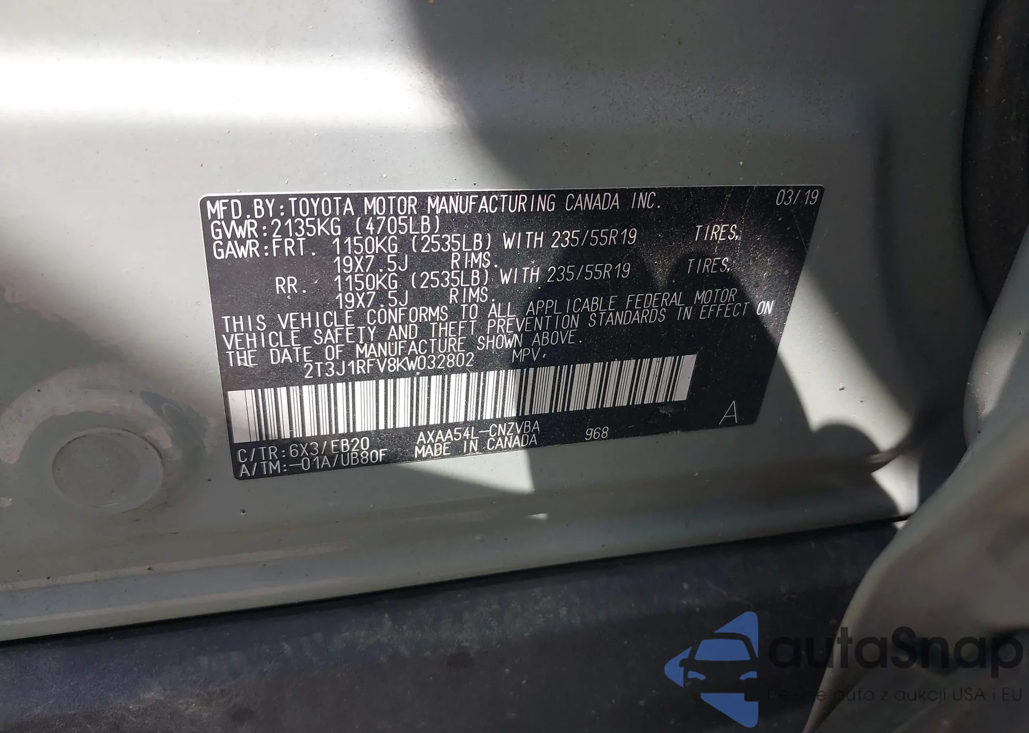 LOT: 43136757 VIN: 2T3J1RFV8KW032802