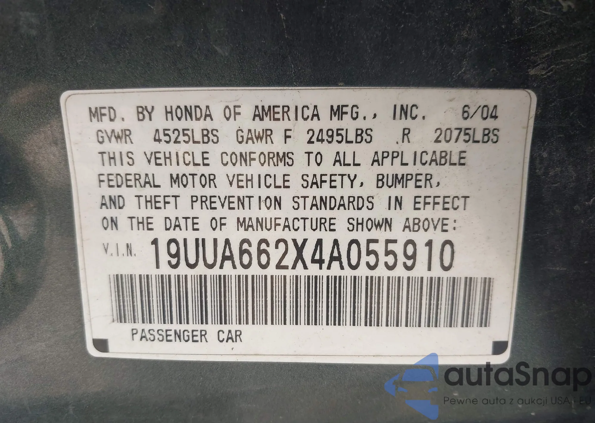 LOT: 43290234 VIN: 19UUA662X4A055910
