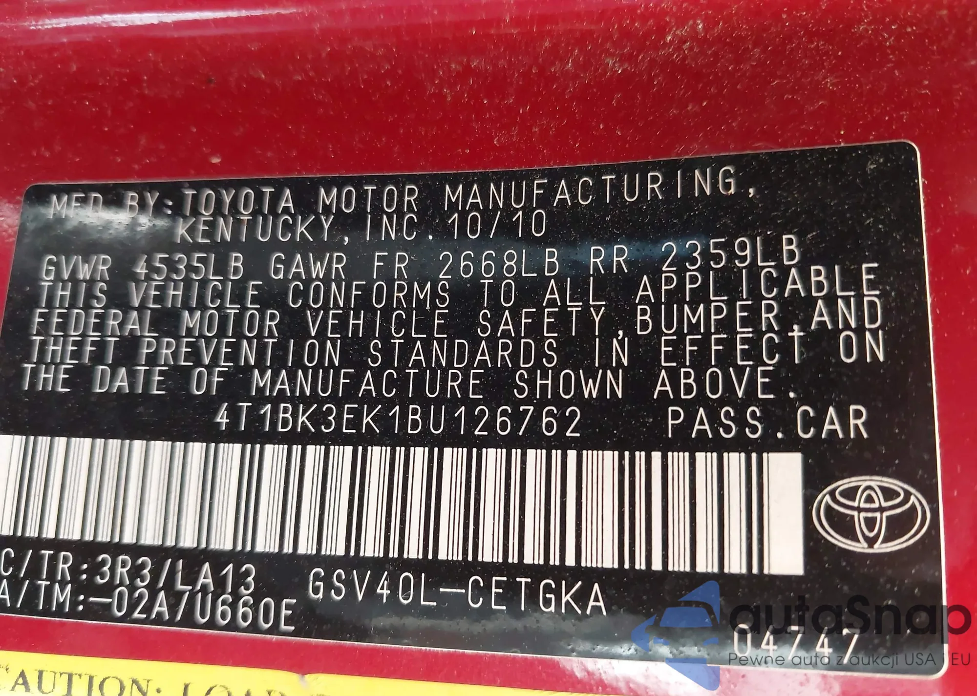 LOT: 43304001 VIN: 4T1BK3EK1BU126762