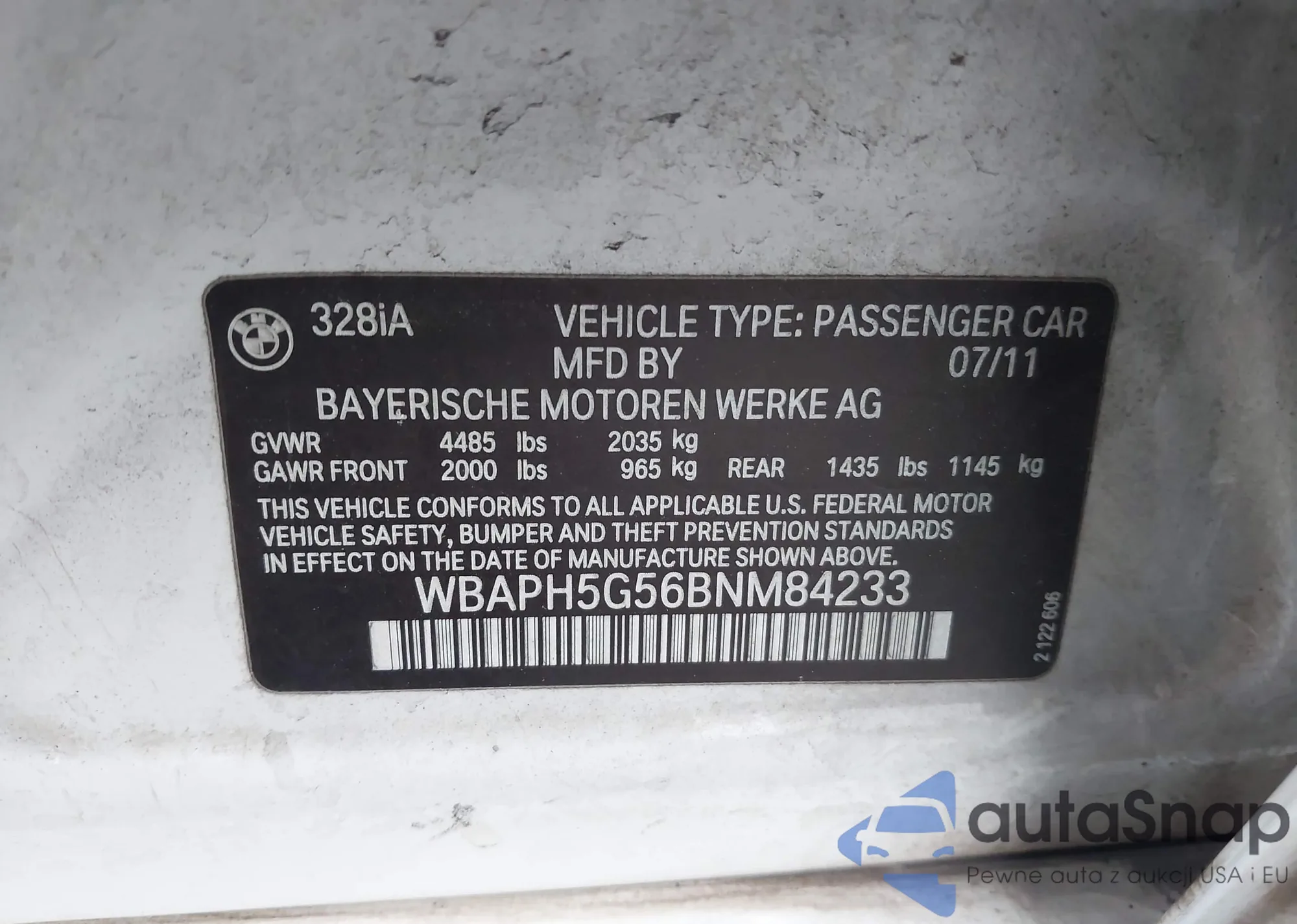 LOT: 43182500 VIN: WBAPH5G56BNM84233