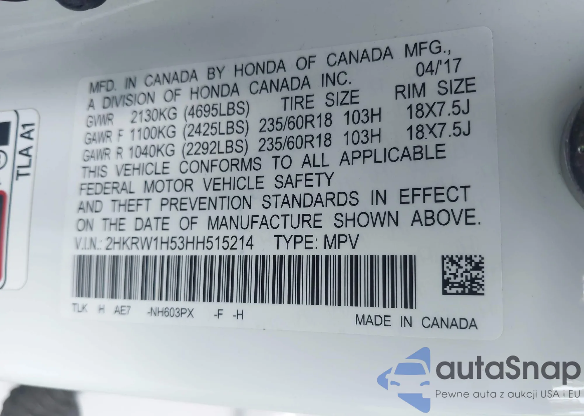 • VIN 2HKRW1H53HH515214