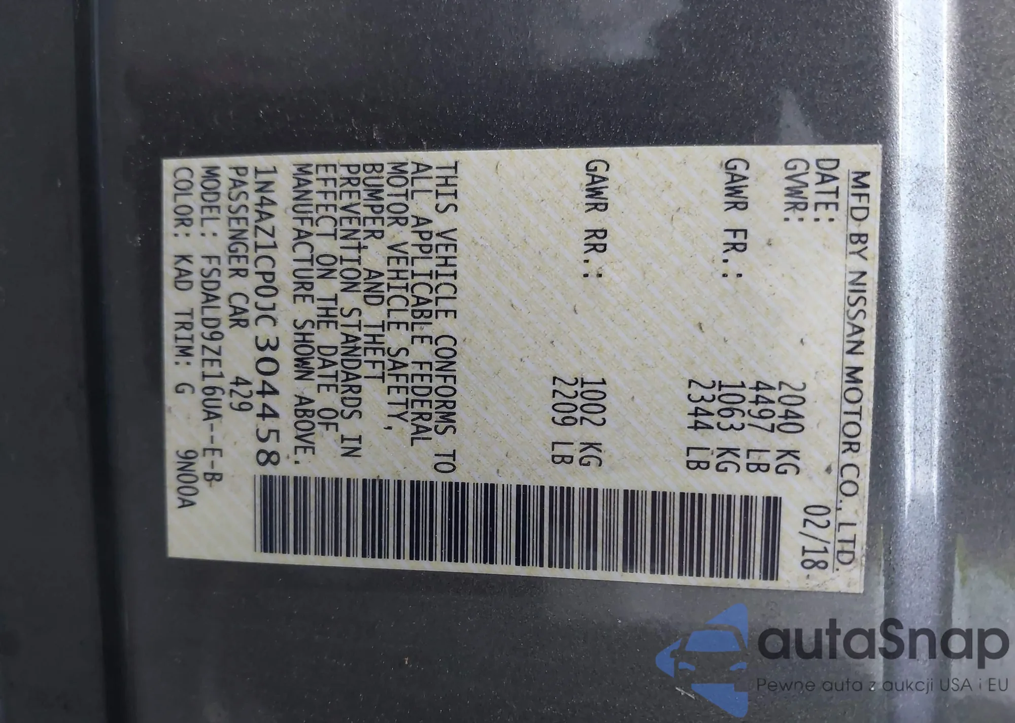 • VIN 1N4AZ1CP0JC304458