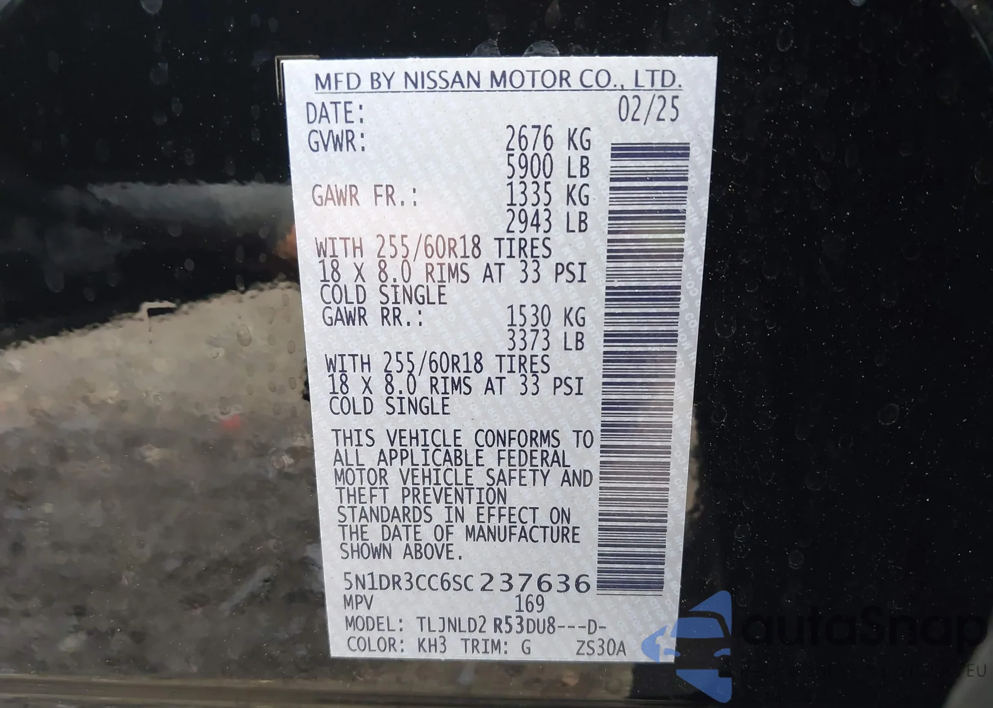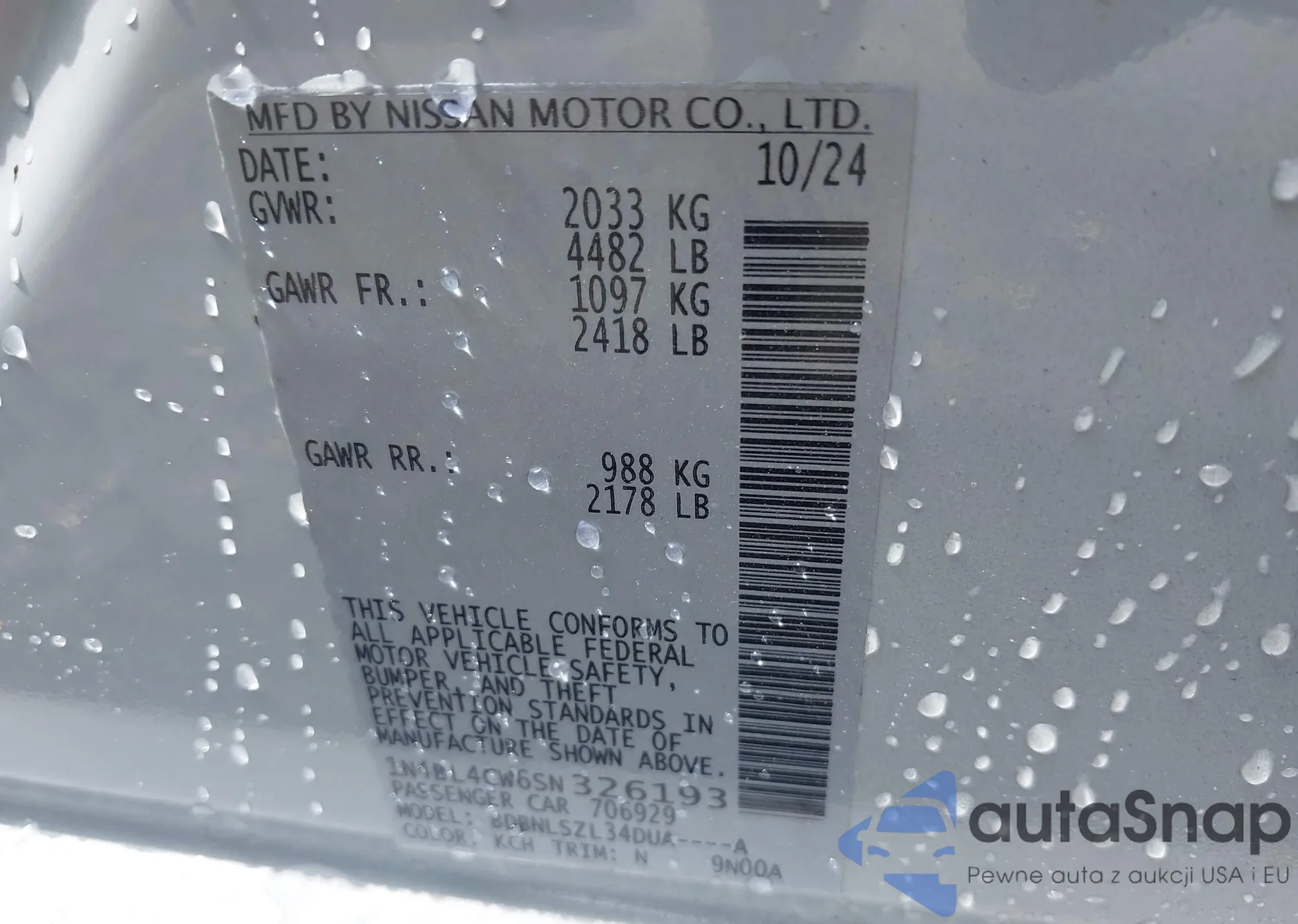 LOT: 43081449 VIN: 1N4BL4CW6SN326193