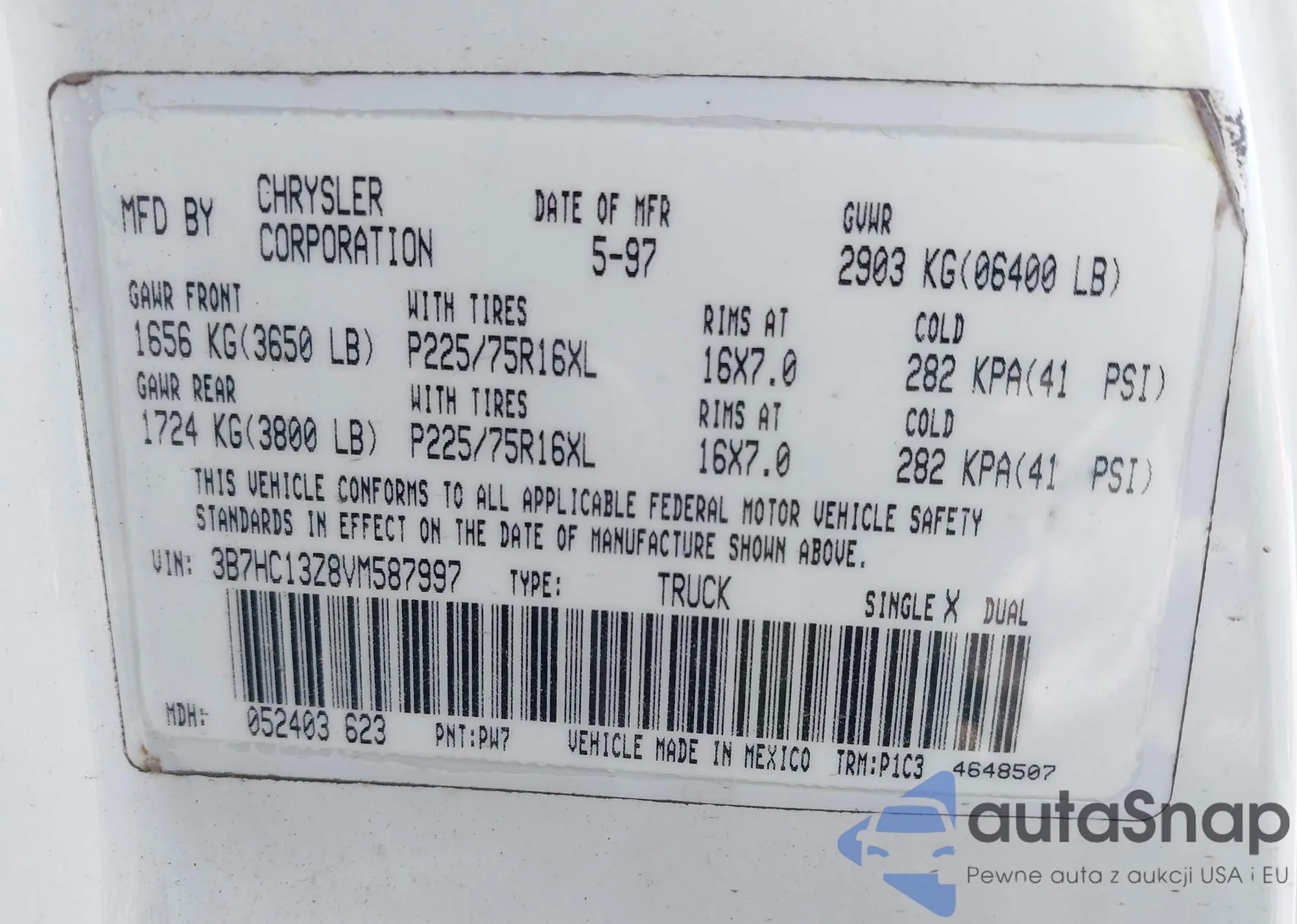 • VIN 3B7HC13Z8VM587997