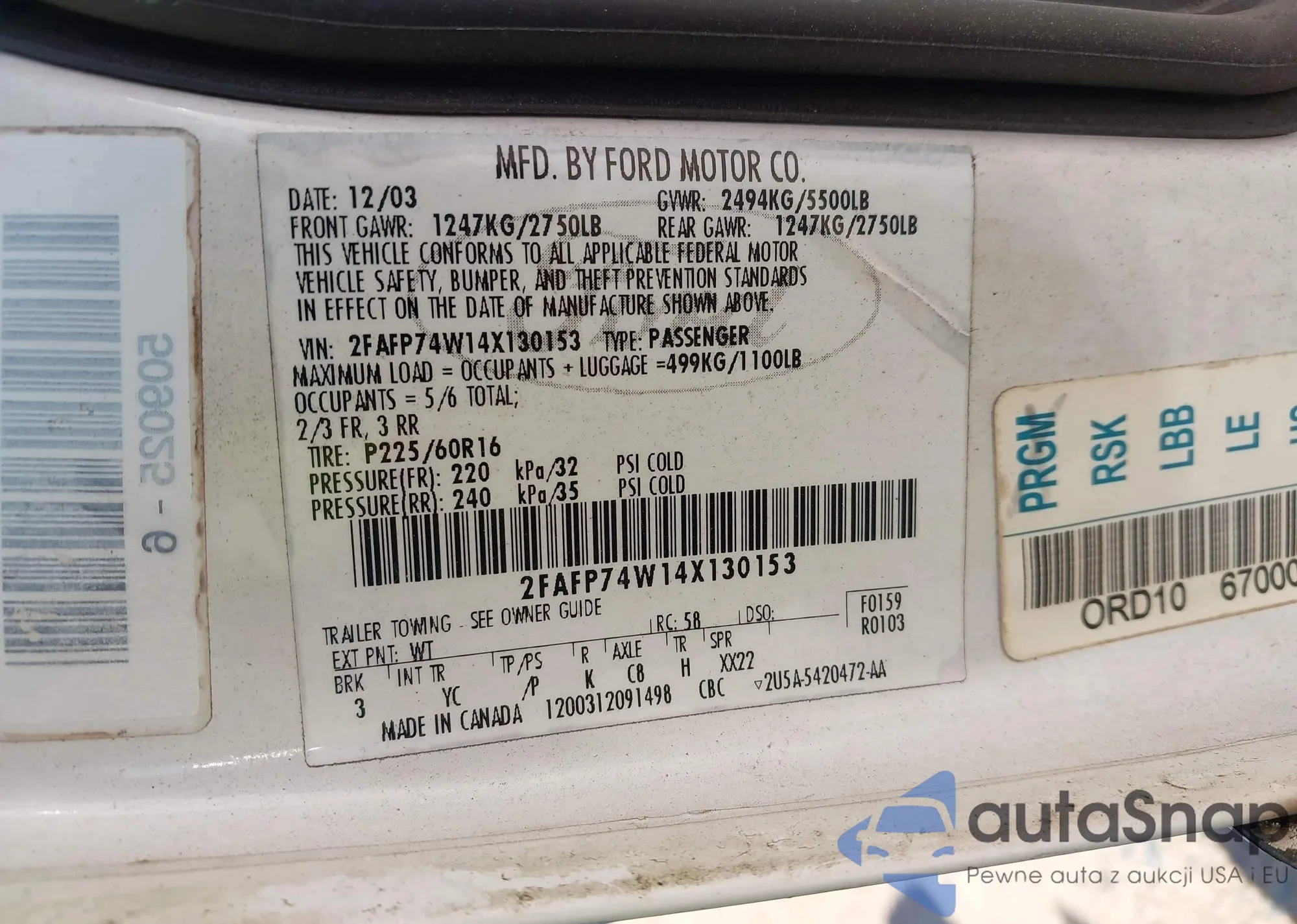 LOT: 43160730 VIN: 2FAFP74W14X130153