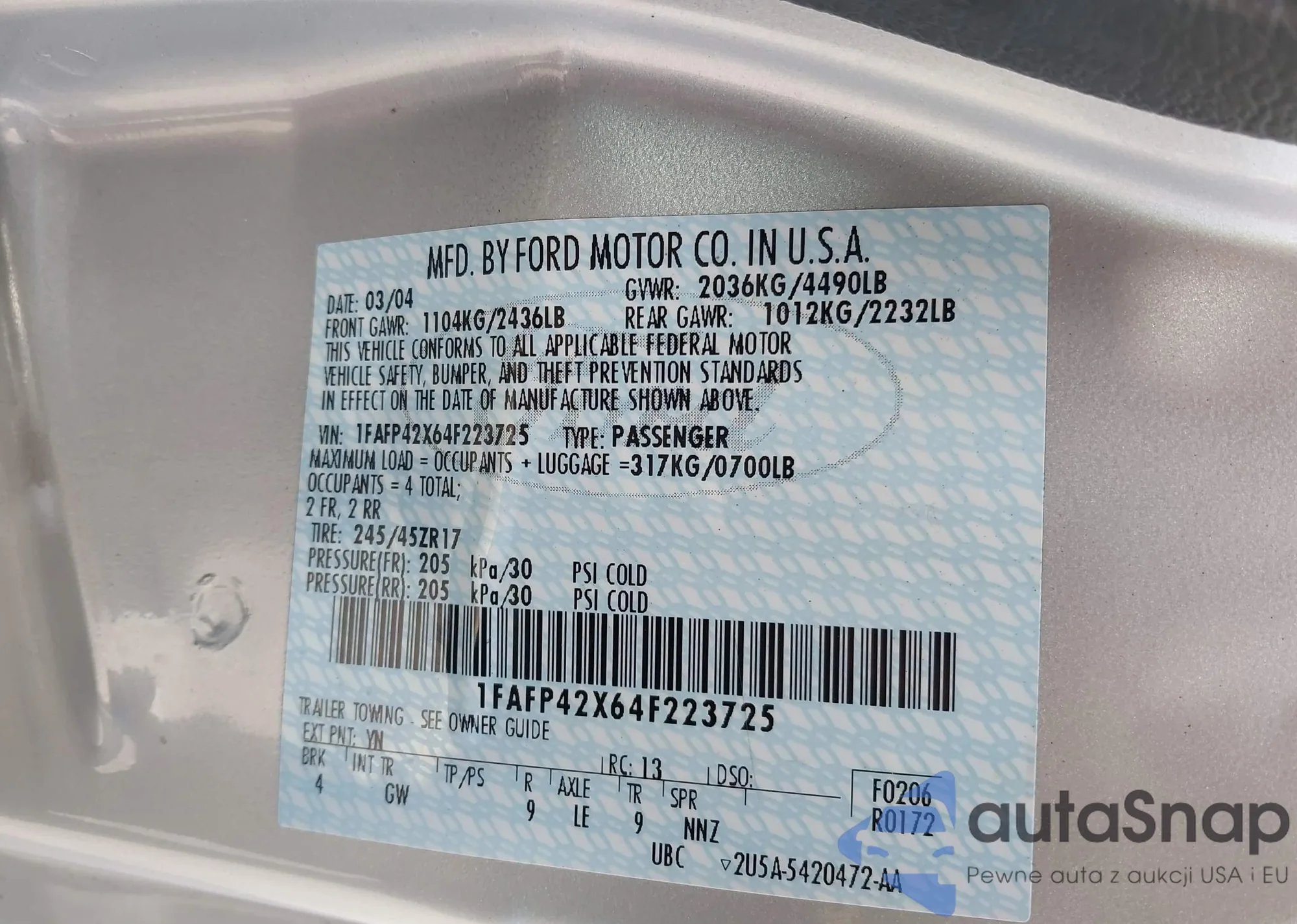 LOT: 43385059 VIN: 1FAFP42X64F223725