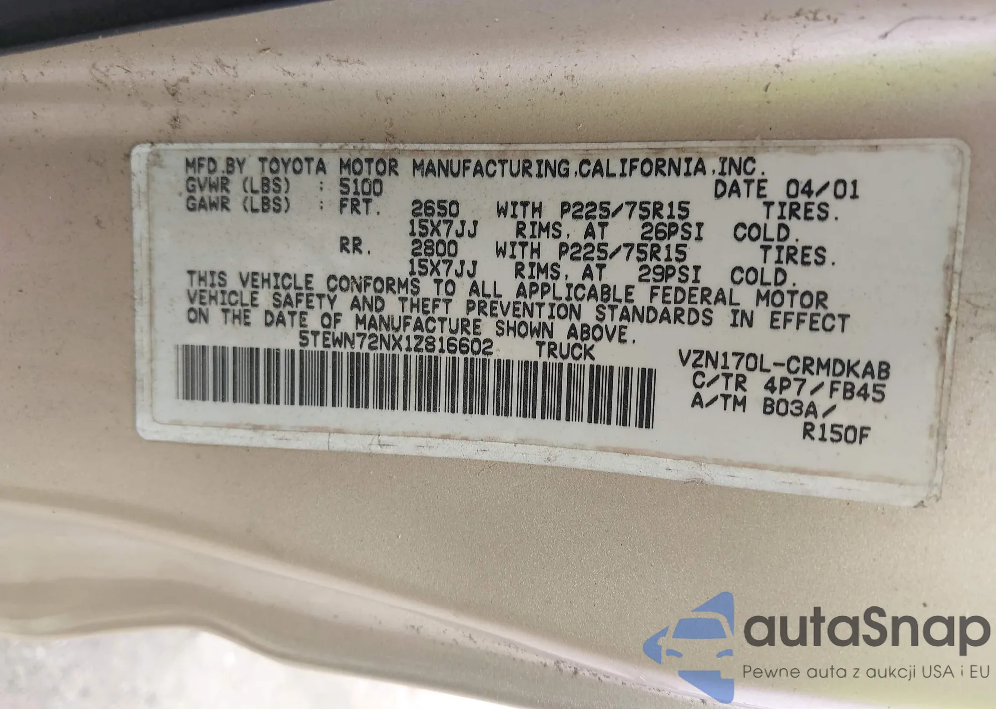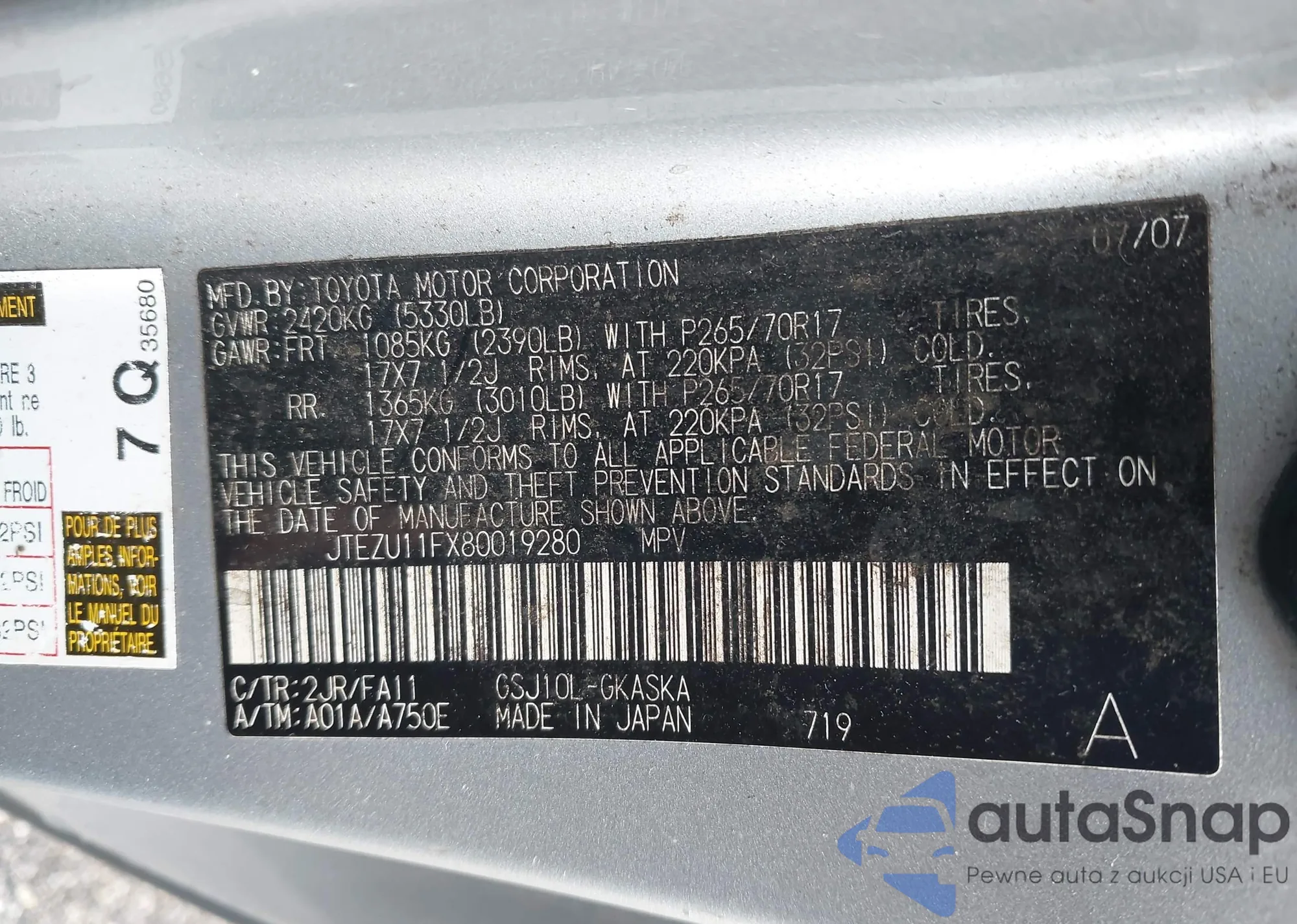 LOT: 43262104 VIN: JTEZU11FX80019280