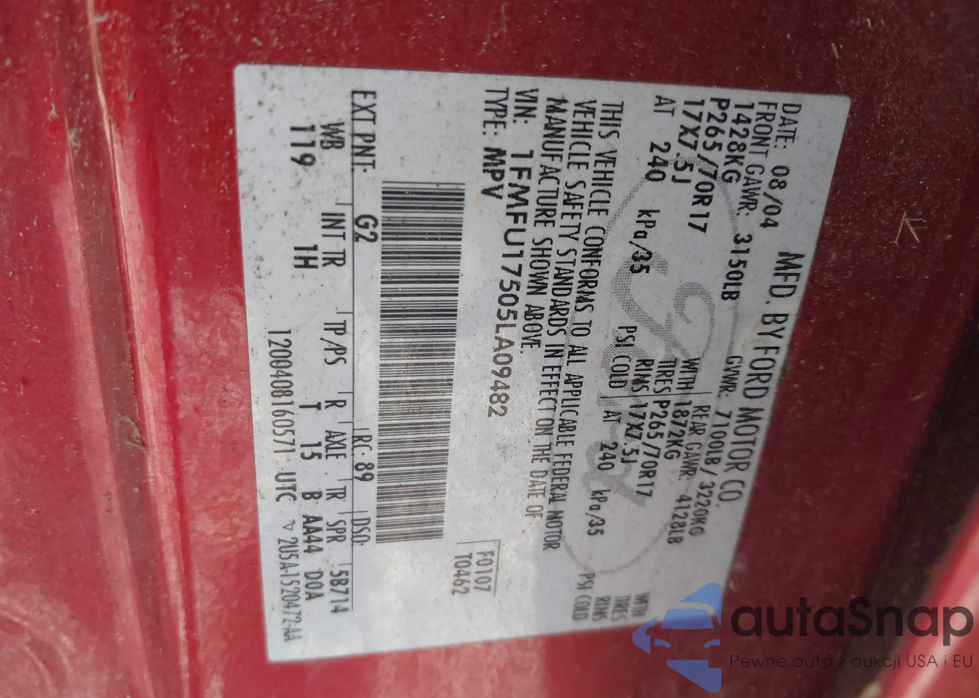 LOT: 43274445 VIN: 1FMFU17505LA09482
