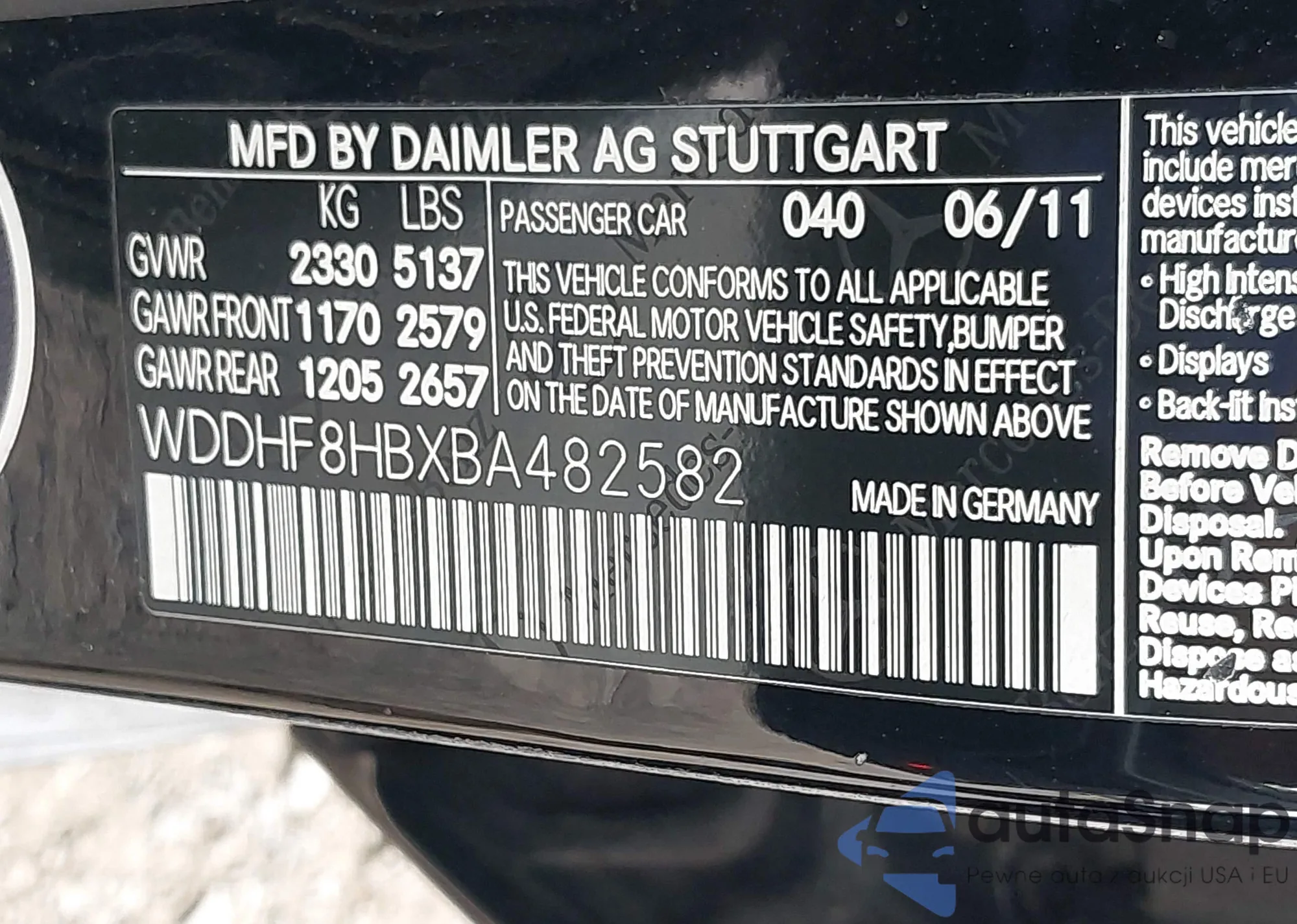 LOT: 43299805 VIN: WDDHF8HBXBA482582