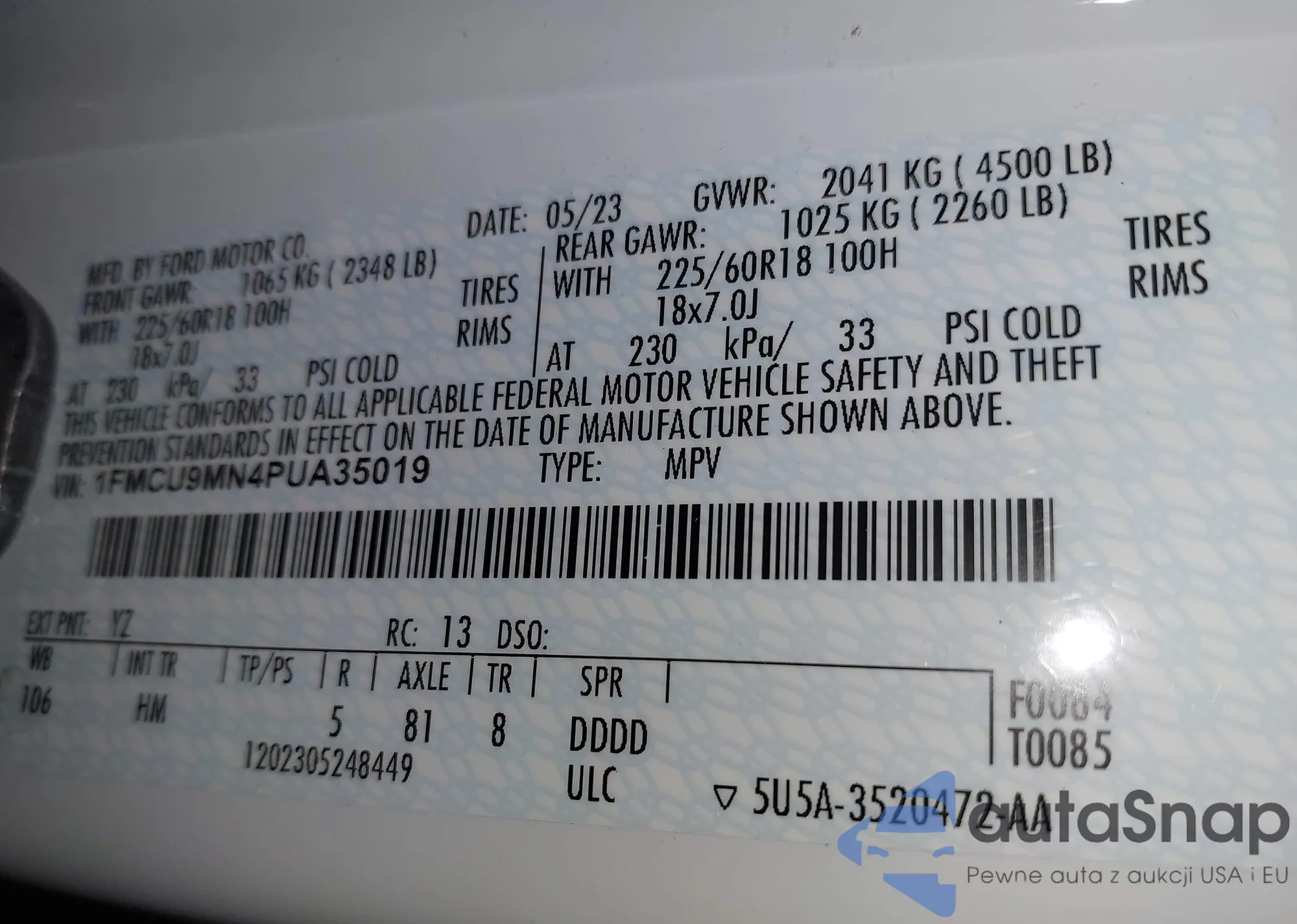 LOT: 42332108 VIN: 1FMCU9MN4PUA35019