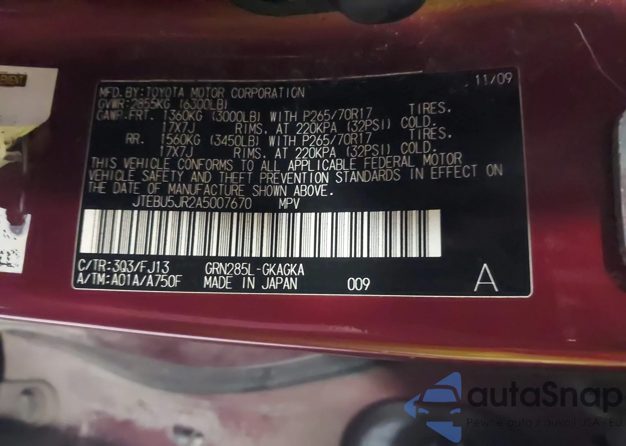 LOT: 43094627 VIN: JTEBU5JR2A5007670