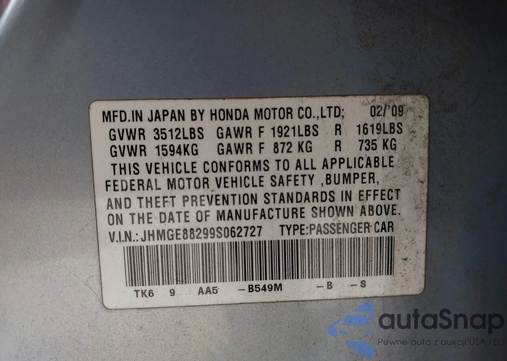 LOT: 43112511 VIN: JHMGE88299S062727