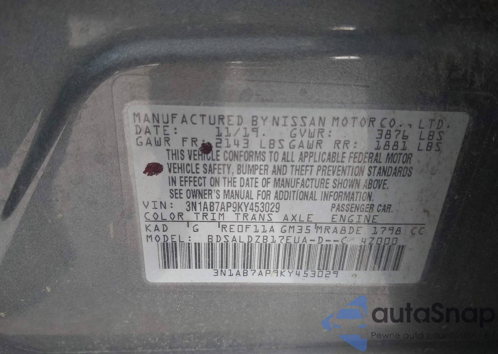• VIN 3N1AB7AP9KY453029