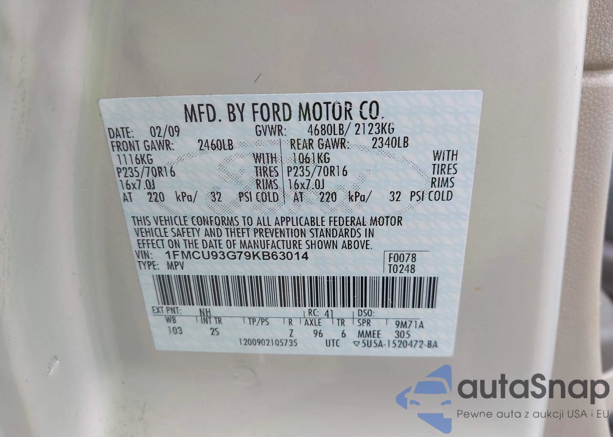• VIN 1FMCU93G79KB63014