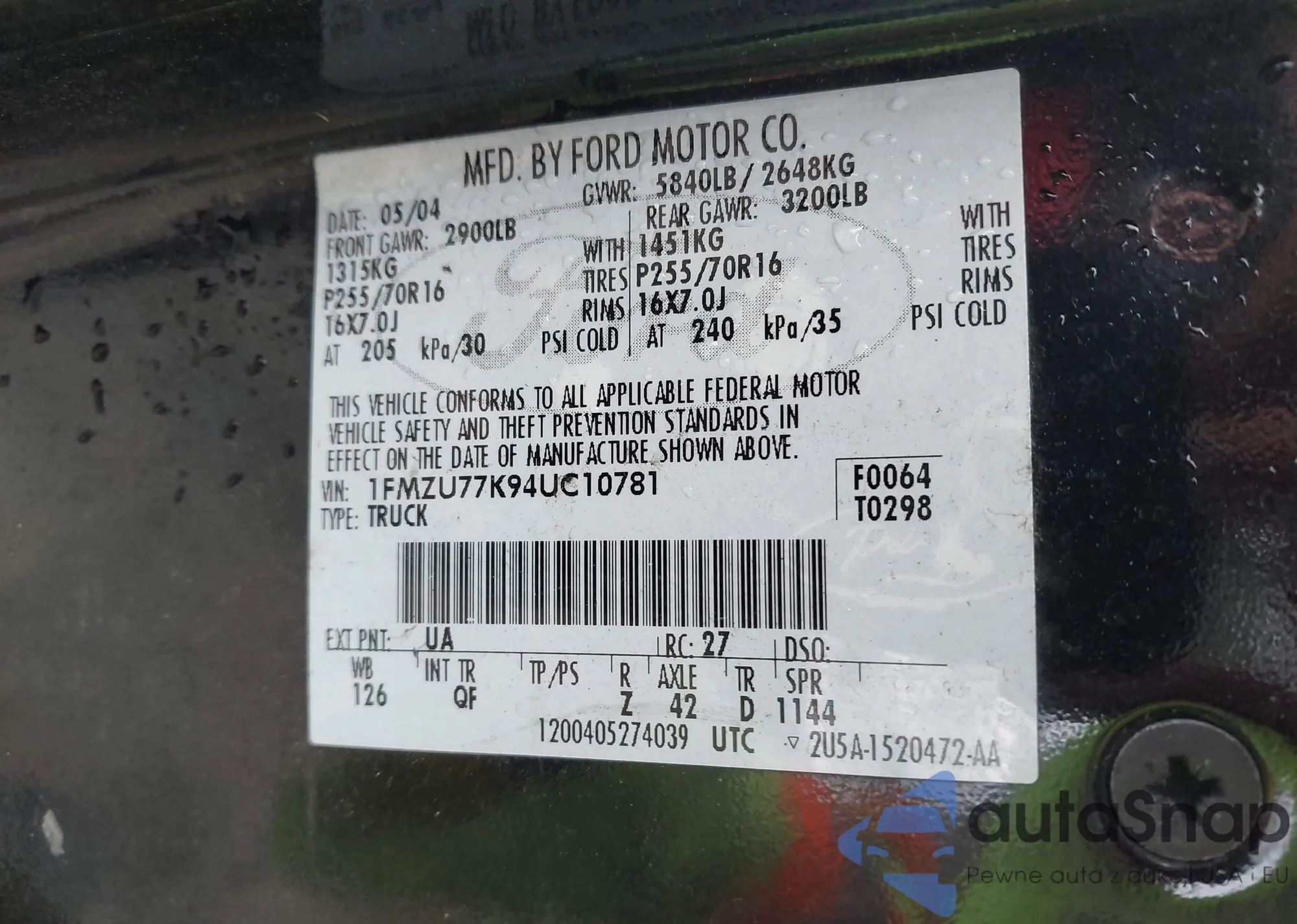 • VIN 1FMZU77K94UC10781