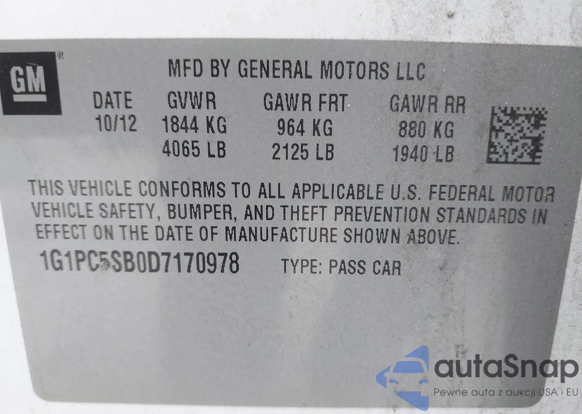 LOT: 43280164 VIN: 1G1PC5SB0D7170978