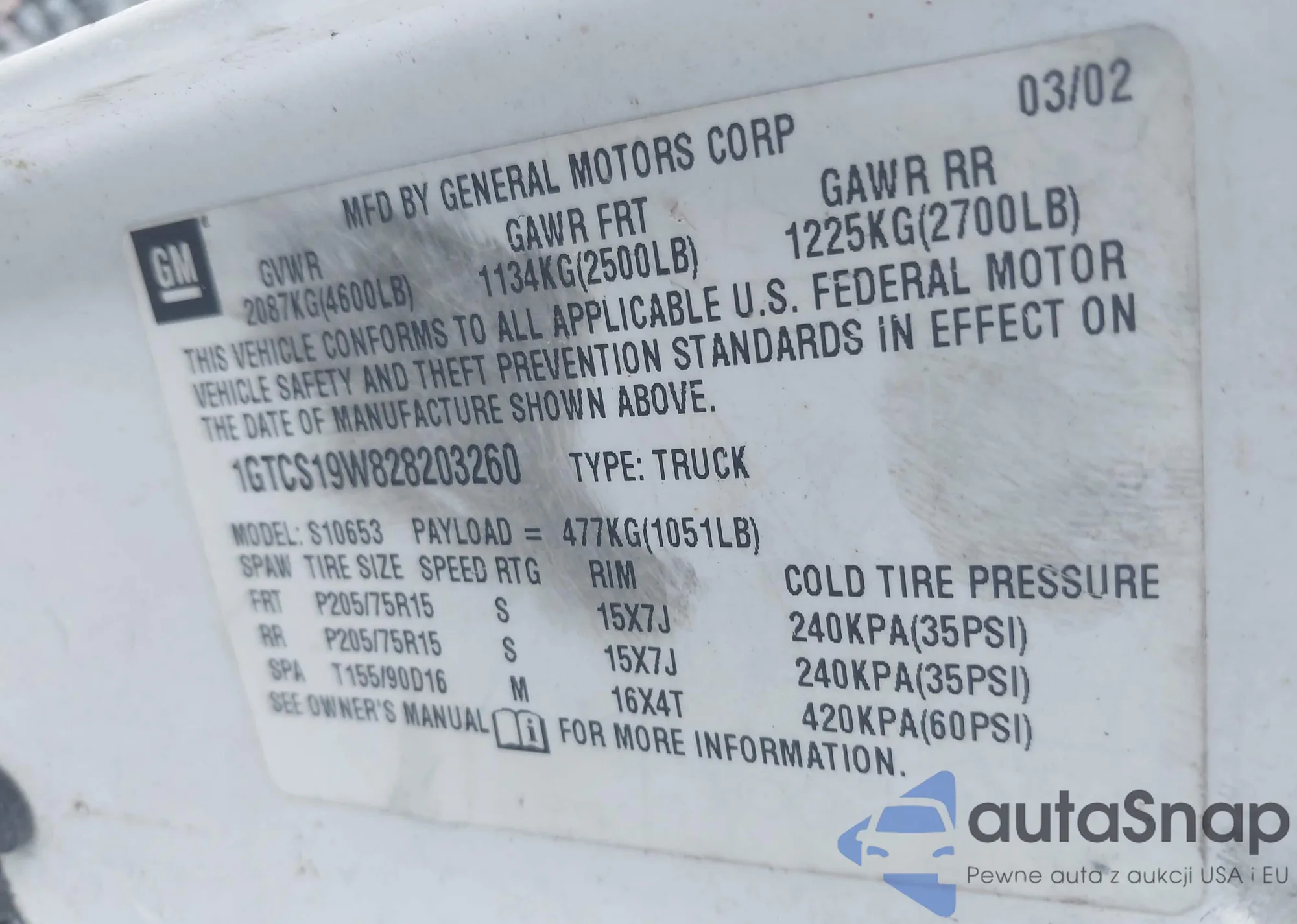 • VIN 1GTCS19W828203260