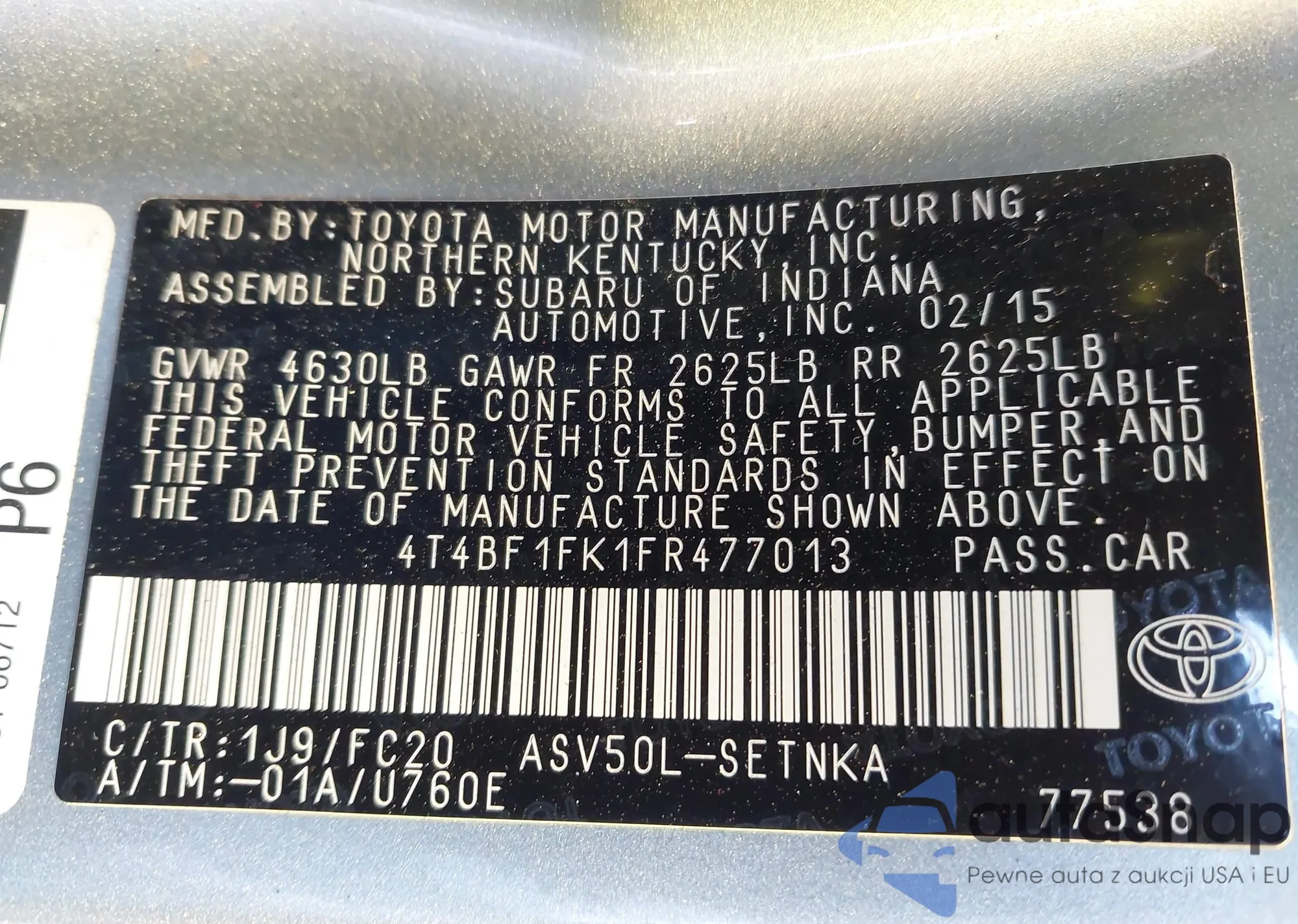 • VIN 4T4BF1FK1FR477013