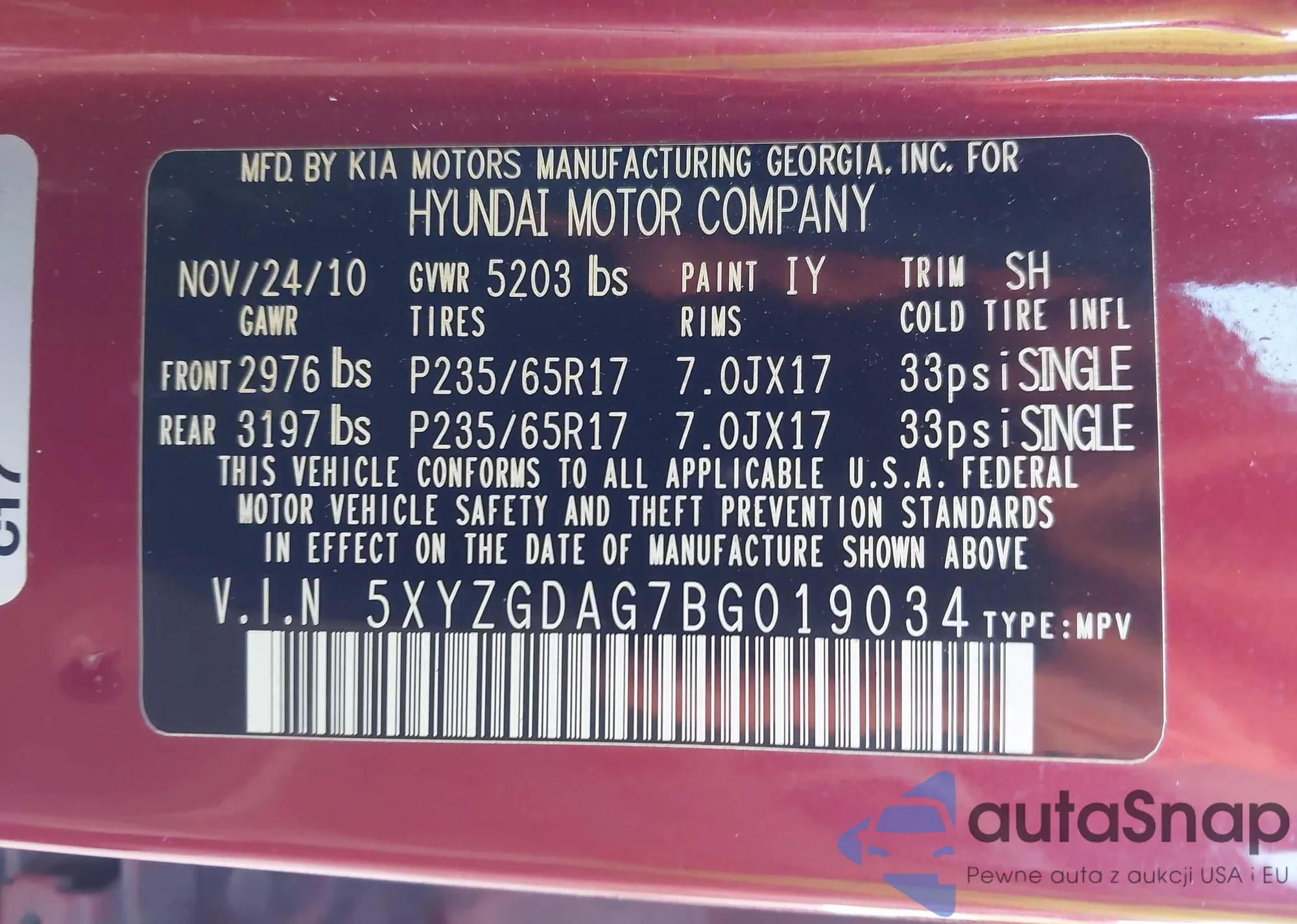 LOT: 43132231 VIN: 5XYZGDAG7BG019034