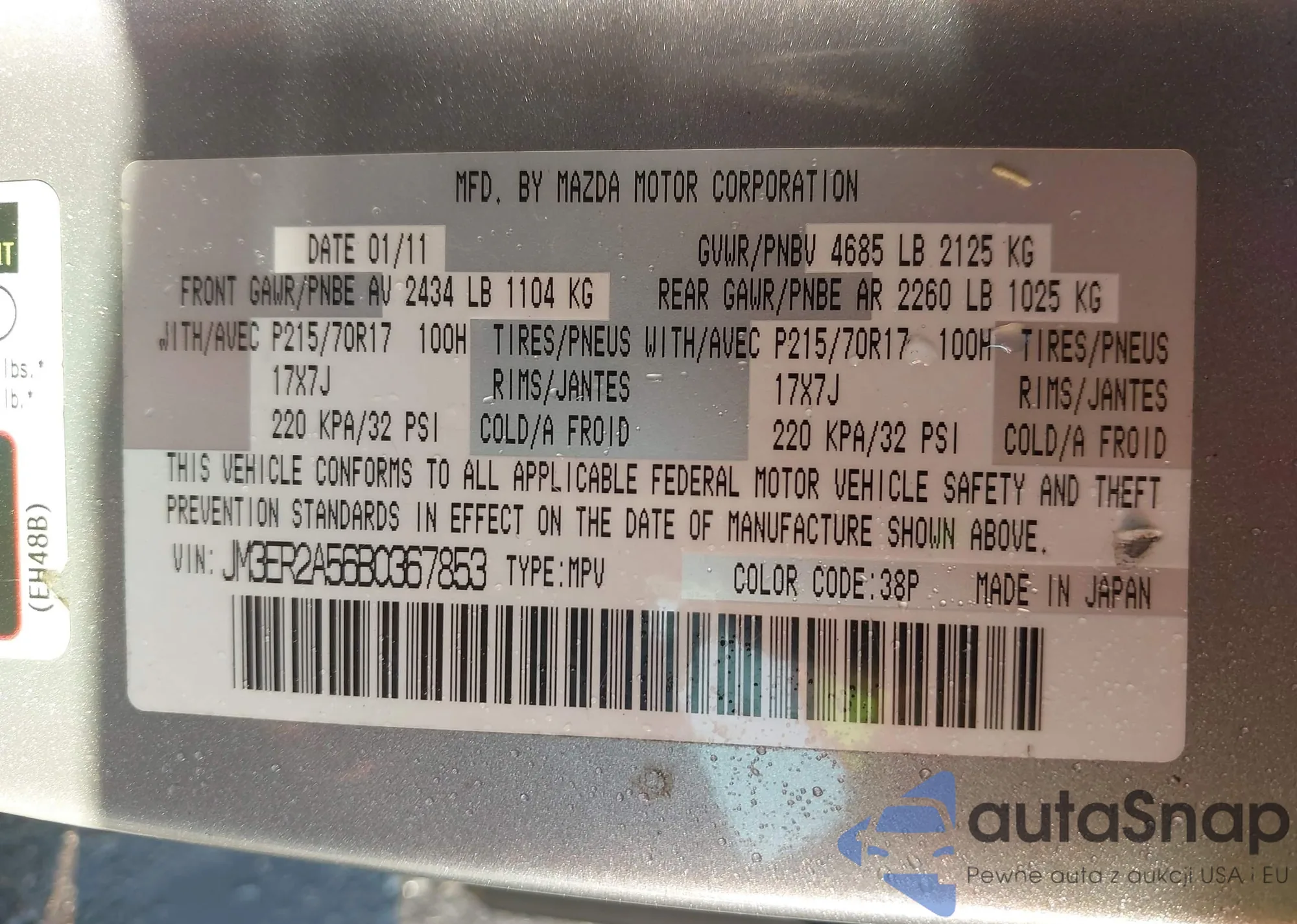 LOT: 43269427 VIN: JM3ER2A56B0367853
