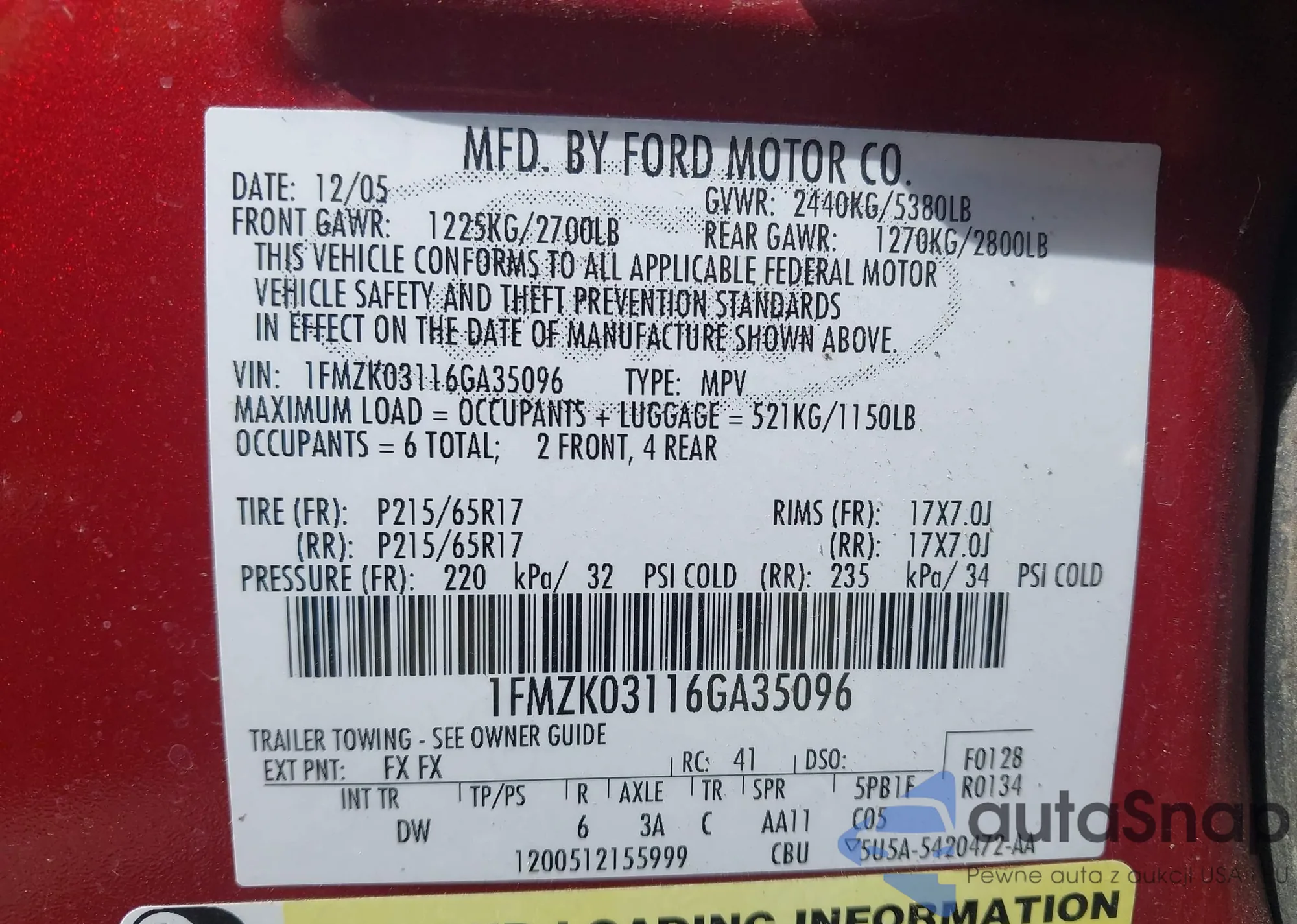 LOT: 43125010 VIN: 1FMZK03116GA35096