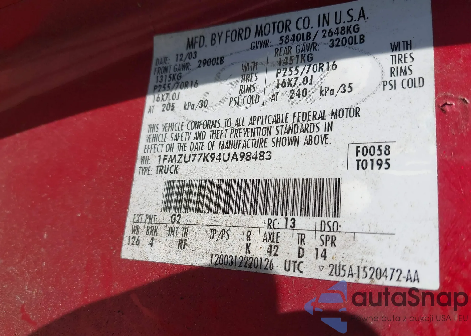 LOT: 43211194 VIN: 1FAFP4043YF257491
